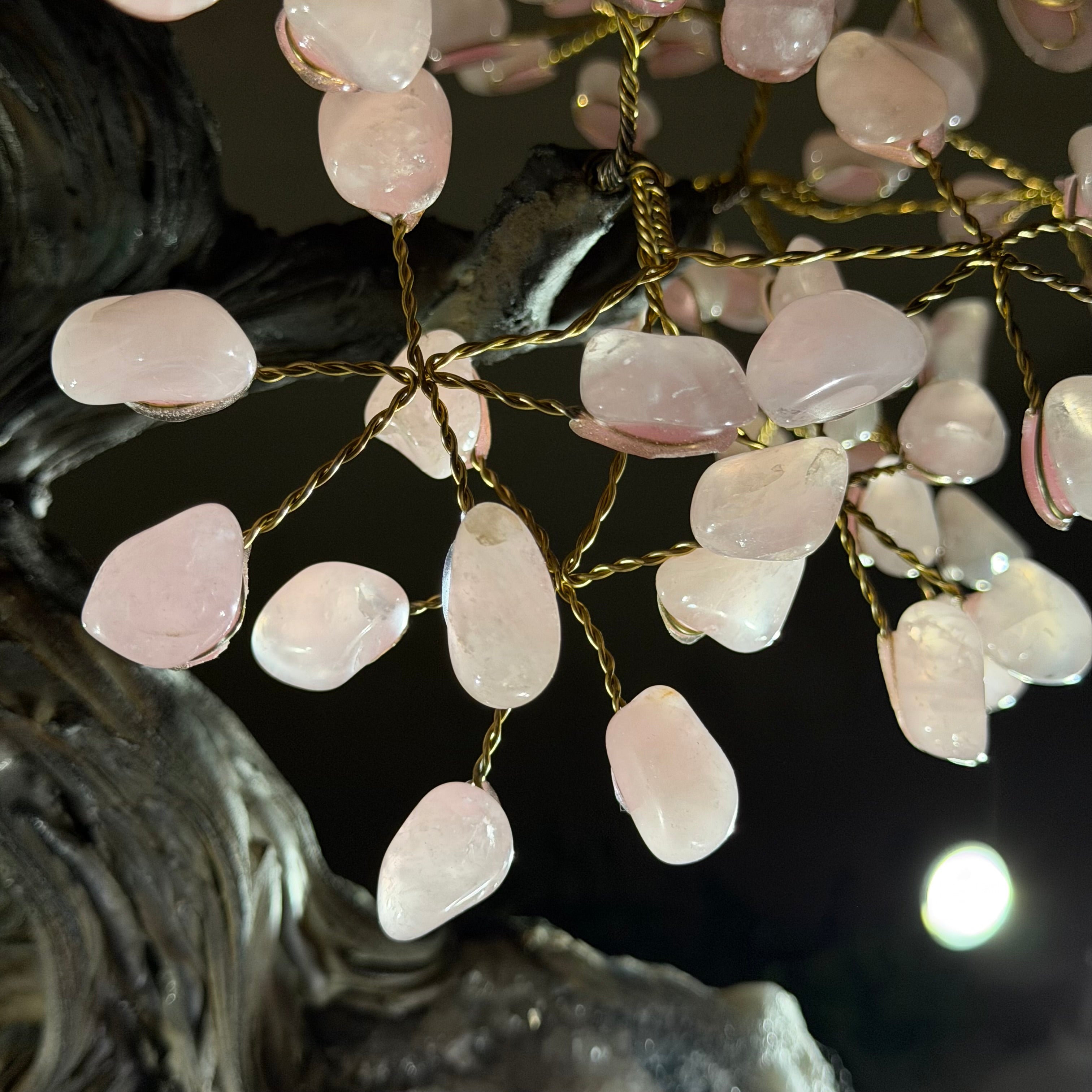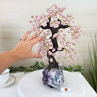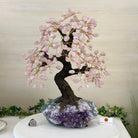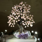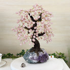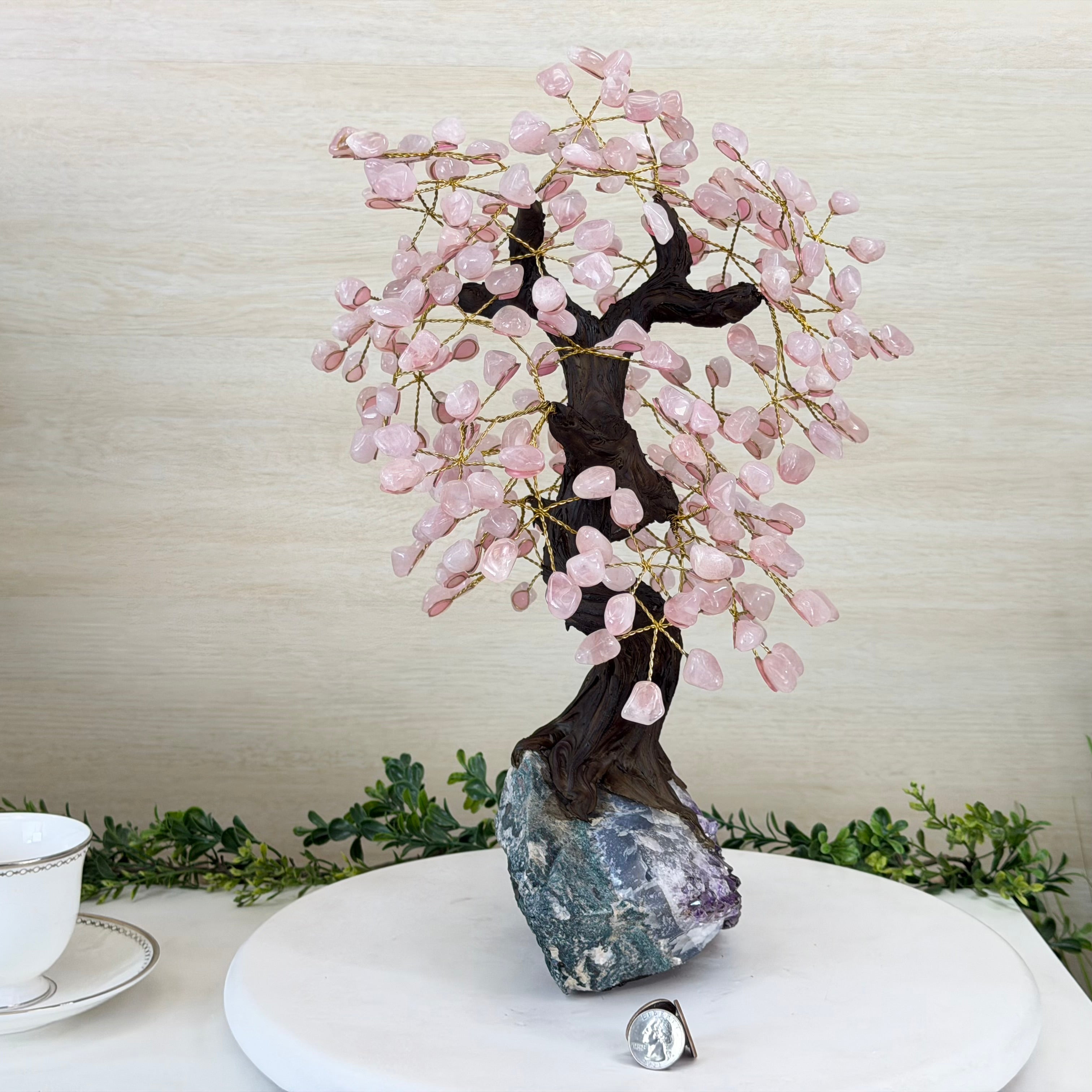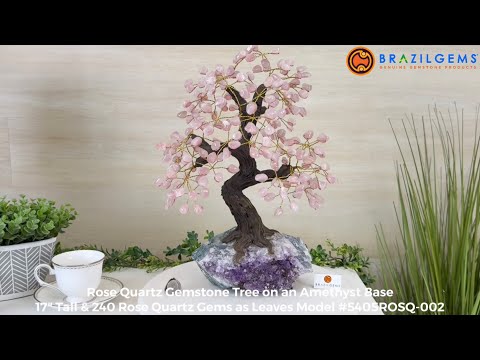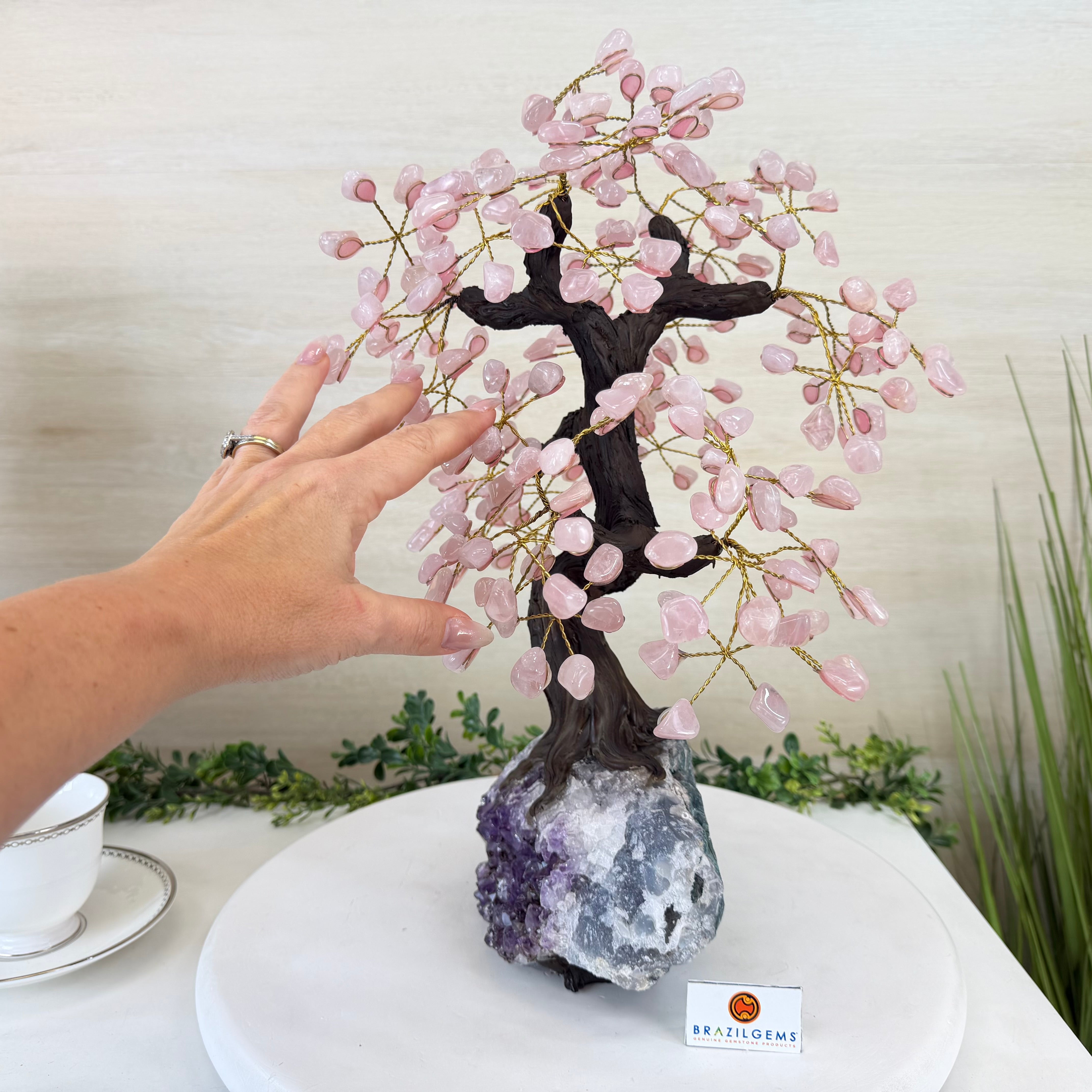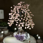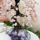 Rose Quartz Bonsai Gemstone Tree on an Amethyst Cluster Base Handcrafted in Brazil, this striking gemstone tree stands approximately 17" tall and features a sturdy bonsai-style trunk and branches adorned with 240 tumbled Rose Quartz gemstones as its leaves.