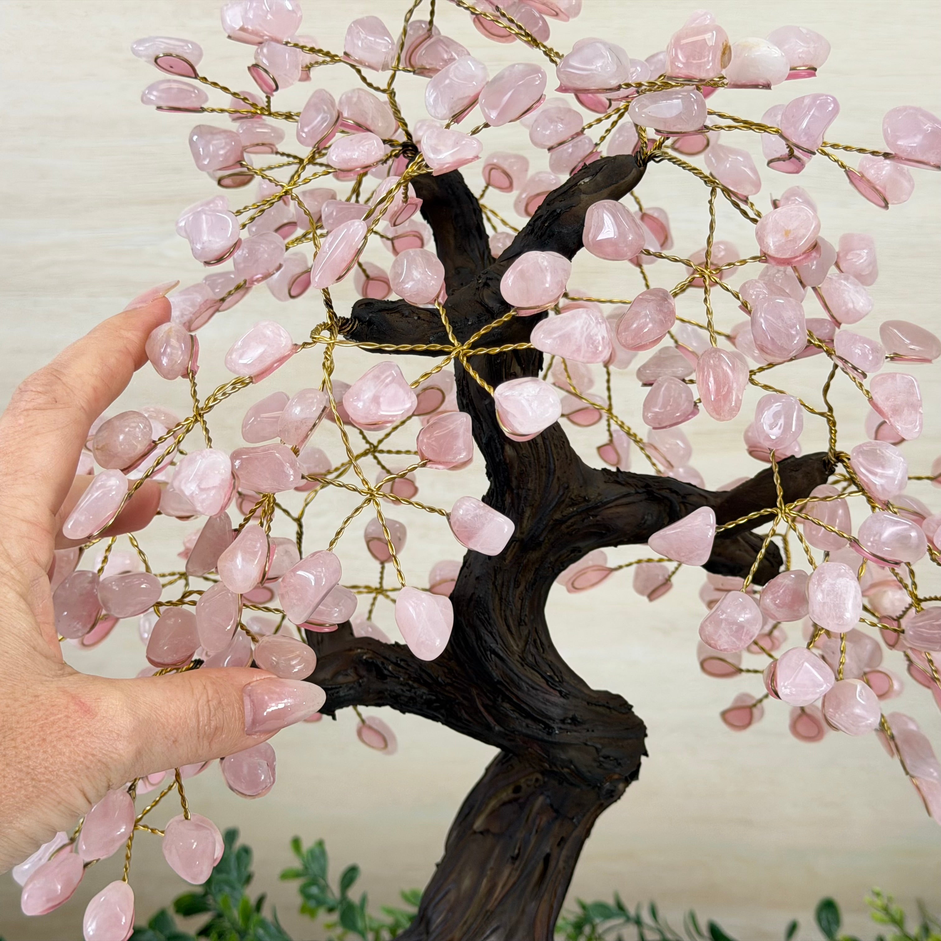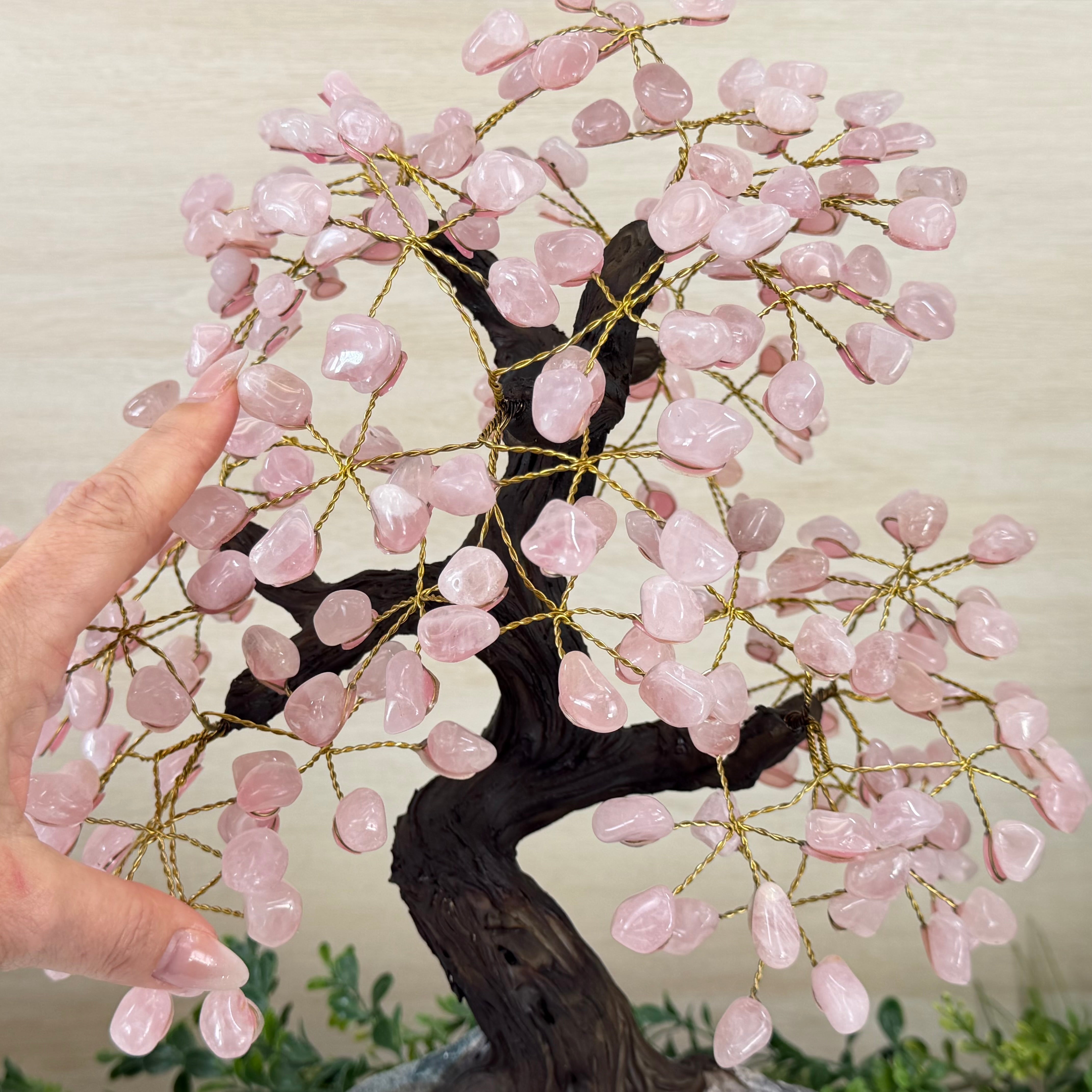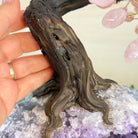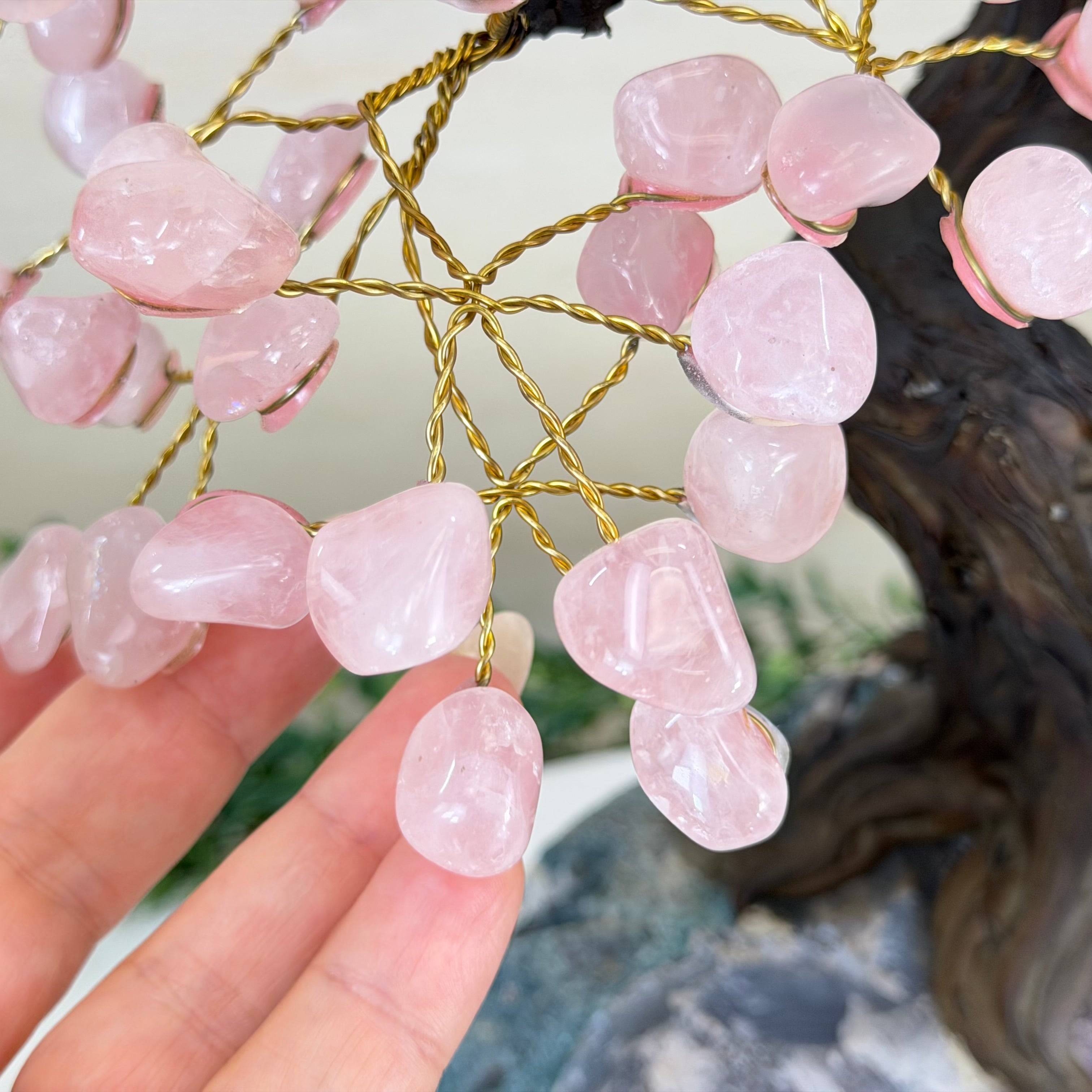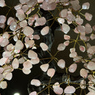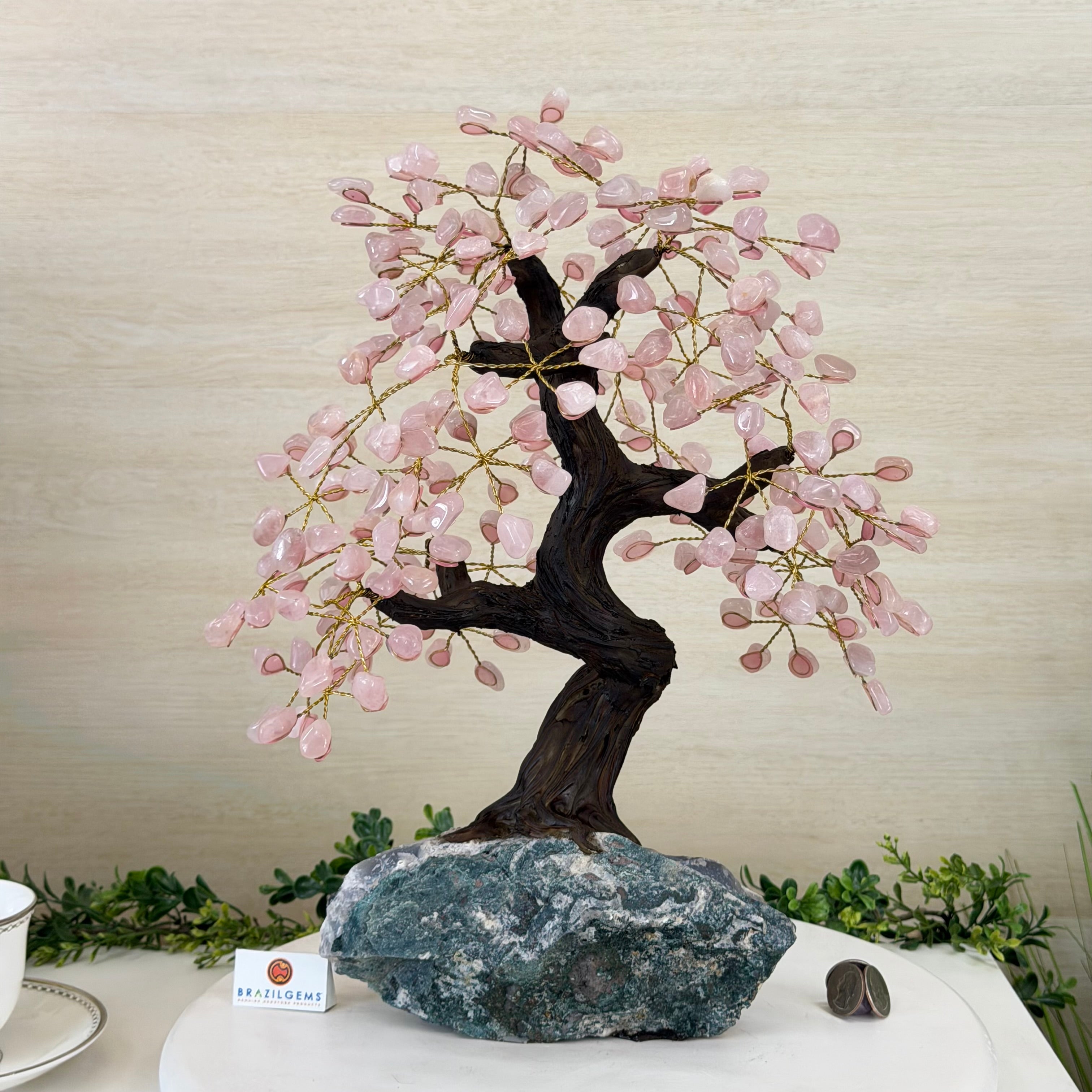 Rose Quartz Bonsai Gemstone Tree on an Amethyst Cluster Base Handcrafted in Brazil, this striking gemstone tree stands approximately 17" tall and features a sturdy bonsai-style trunk and branches adorned with 240 tumbled Rose Quartz gemstones as its leaves.
