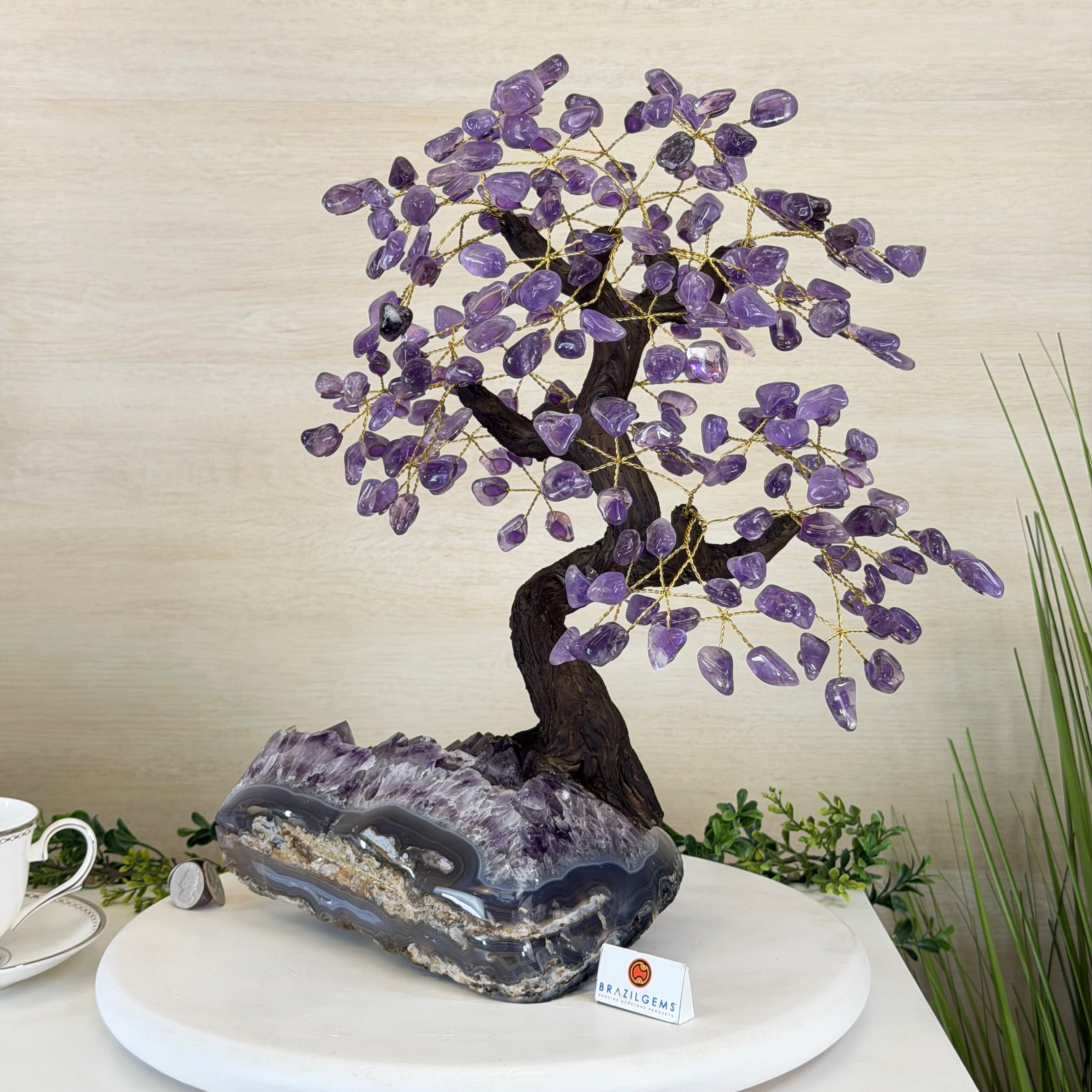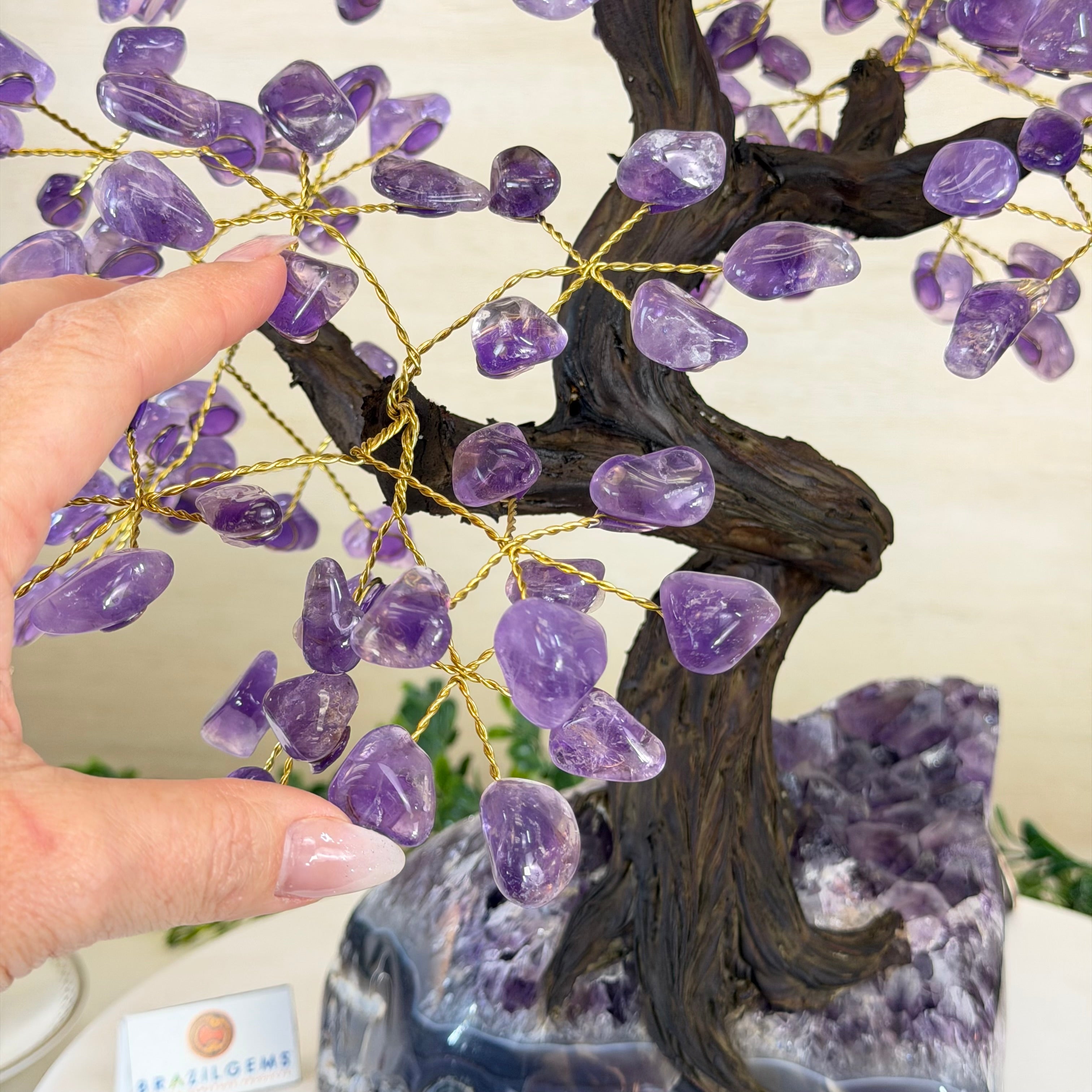 Disclaimer: This is a genuine gemstone handmade item sold by Brazil Gems® as is and as you see it in its images and video. It is the exact tree you will receive. The base may contain natural imperfections as well as imperfections, repairs and broken edges from the extraction, polishing, and prepping processes and the branches and leaf gemstones may contain imperfections as well. At Brazil Gems® we make every effort to get measurements as exact as possible but they are done by human hands and eyes and therefore may have minor discrepancies. For safe shipping, the branches will arrive compacted—you’ll simply need to gently “fluff” or spread them into place upon arrival. Also, it's possible a gemstone "leaf" might fall off of a branch. If this happens, it's a simple fix with hot glue or super glue.