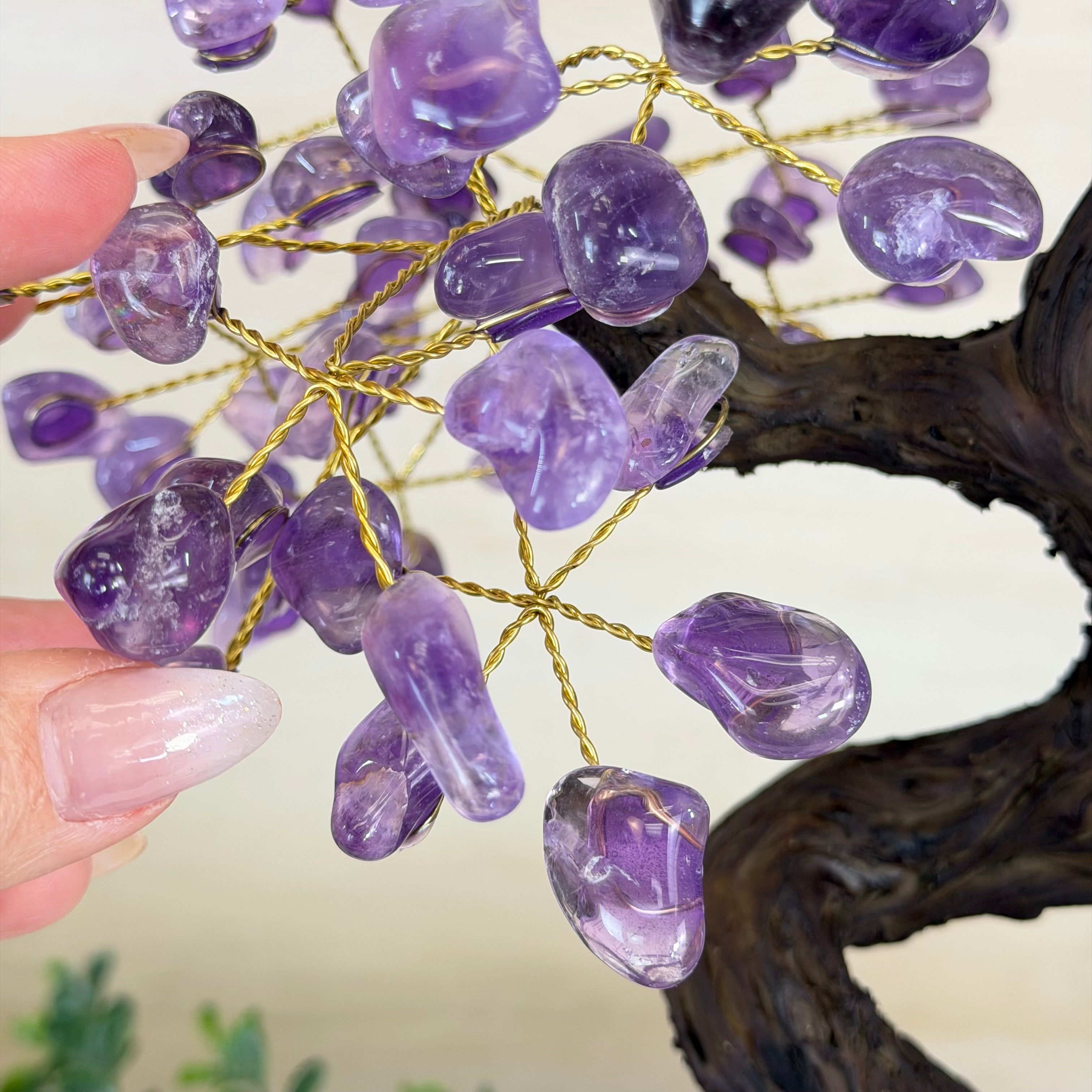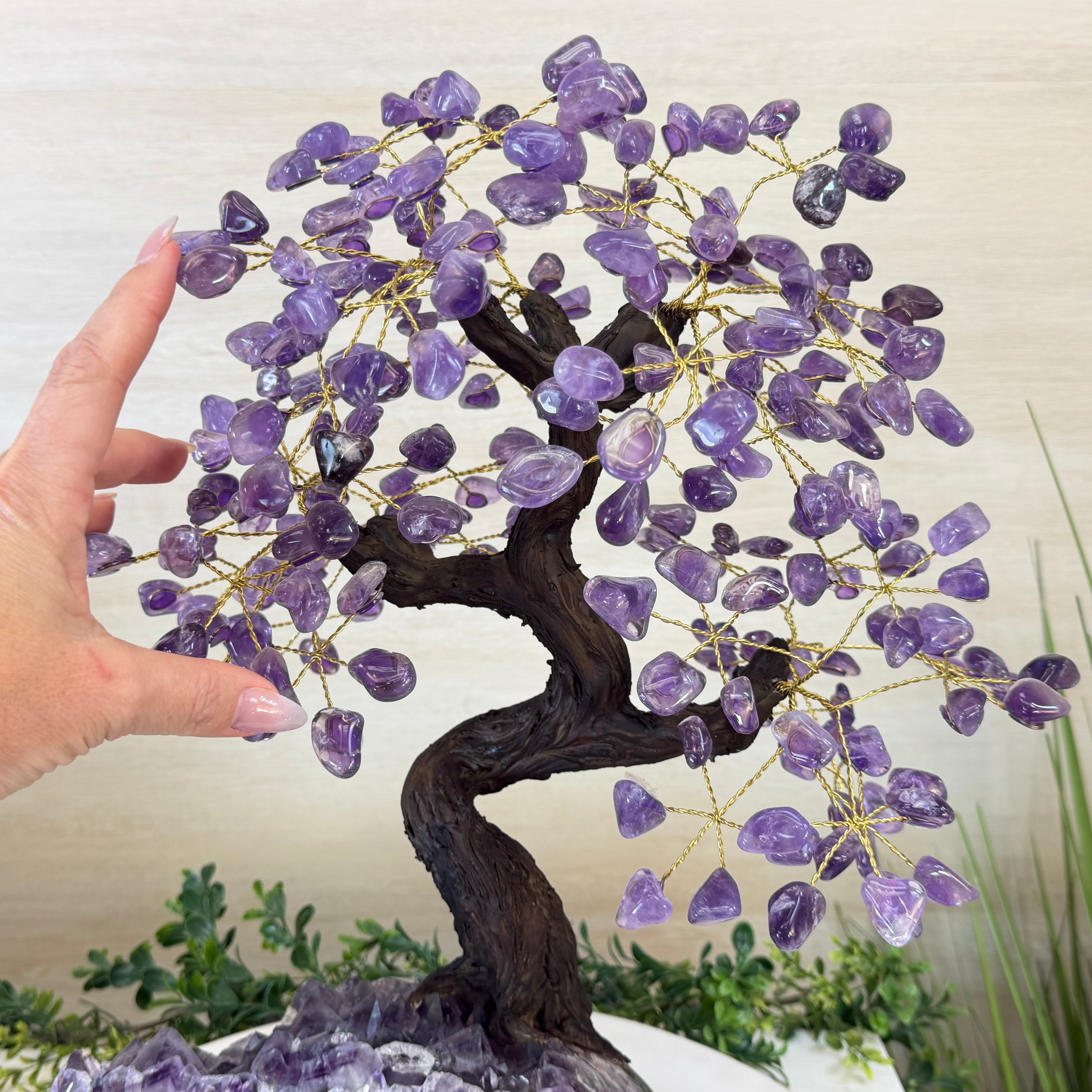 The process to make a gemstone tree like this is very extensive and meticulous. A special polished Amethyst cluster is selected for the base, the resin trunk and branches are crafted into a bonsai style by artisans in Brazil and then each gemstone is glued to the tree by hand. The result is a work of art that radiates harmony, care, and intention.