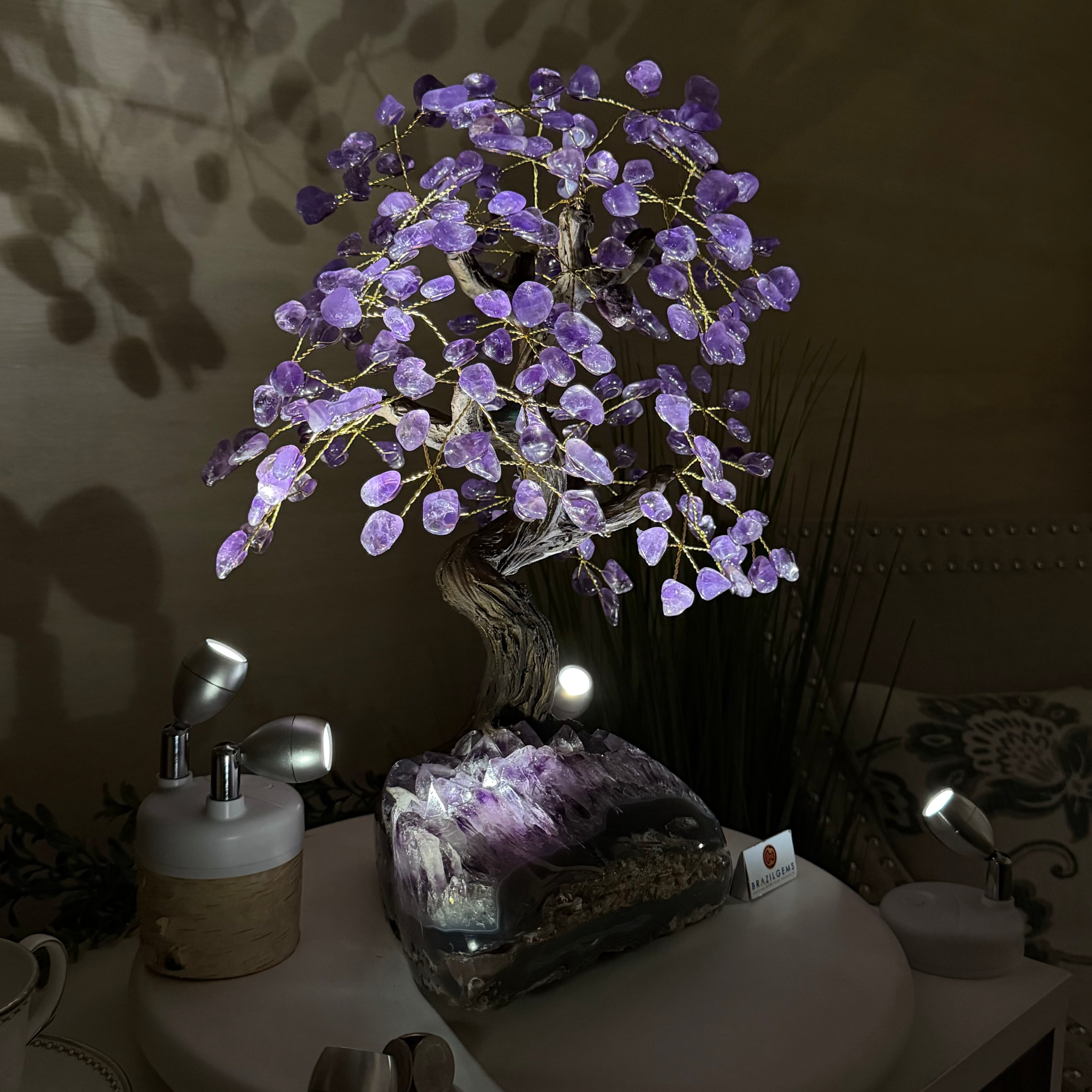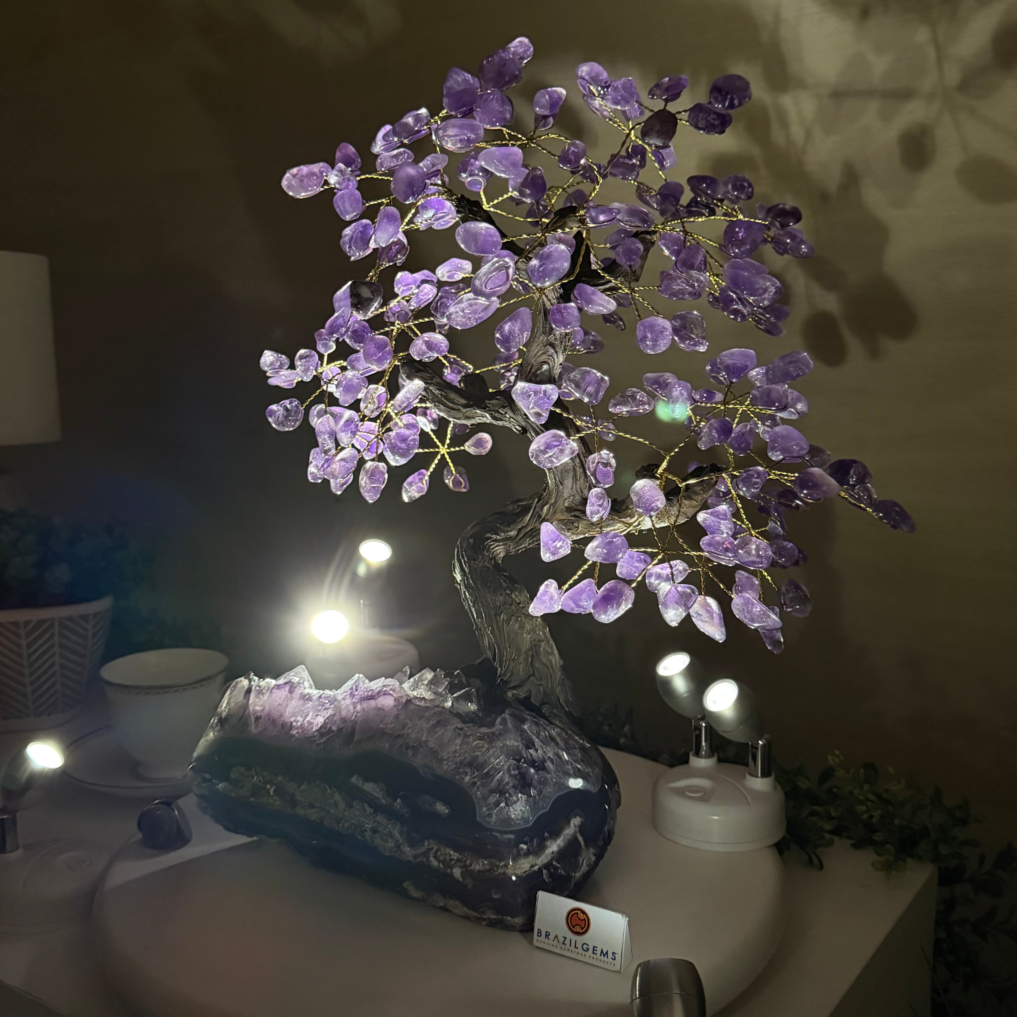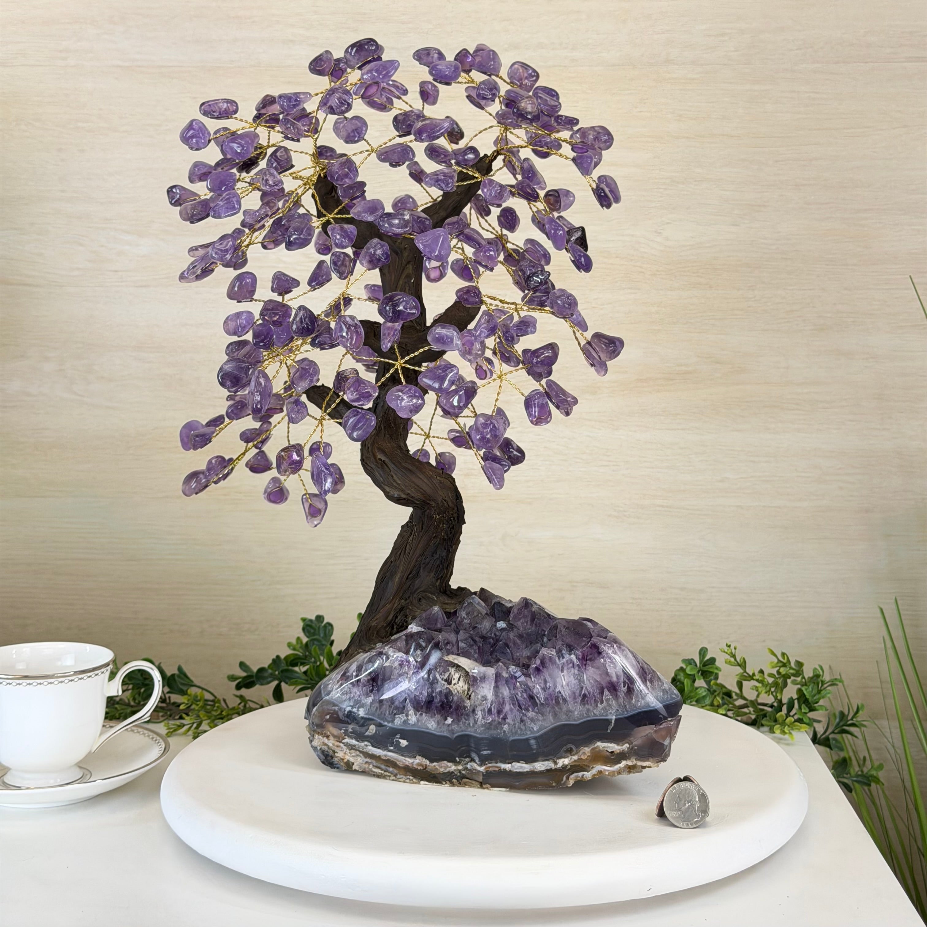 What makes this tree Special? Its polished Amethyst cluster base and its gemstones leaves are of a higher quality crystal with deeper purple colors and clarity making it even more beautiful.