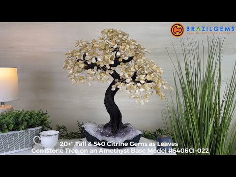 Nature and Artistry combine to create this Large Handmade Gemstone Tree with Citrine Gemstones as leaves. Set atop a large Amethyst cluster base, it has a masterfully detailed trunk and branches crafted from resin in a bonsai tree style and 108 wired branches supporting 540 tumbled gemstones.