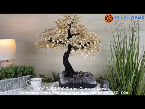 Nature and Artistry combine to create this Large Handmade Gemstone Tree with Citrine Gemstones as leaves. Set atop a large Amethyst cluster base, it has a masterfully detailed trunk and branches crafted from resin in a bonsai tree style and 108 wired branches supporting 540 tumbled gemstones.