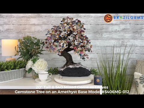 Disclaimer: This is a genuine gemstone handmade item sold by Brazil Gems® as is and as you see it in its images and video. It is the exact tree you will receive. The base may contain natural imperfections as well as imperfections, repairs and broken edges from the extraction, polishing, and prepping processes and the branches and leaf gemstones may contain imperfections as well. To allow for it to stand on its own the amethyst cluster base may have a small amount of cement added to the bottom then painted black. At Brazil Gems® we make every effort to get measurements as exact as possible but they are done by human hands and eyes and therefore may have minor discrepancies. Mixed Gems trees in this size may include (and usually do) the following gemstones: Amethyst, Carnelian, Citrine, Clear Quartz, Green Quartz, Rose Quartz, Blue Quartz, Hematite, Dyed Pink Agate, Dyed Purple Agate, Dyed Blue Agate, Red Jasper, Yellow Jasper, Zebra Jasper, Sodalite and Tiger's Eye. Other gemstones maybe included as well.