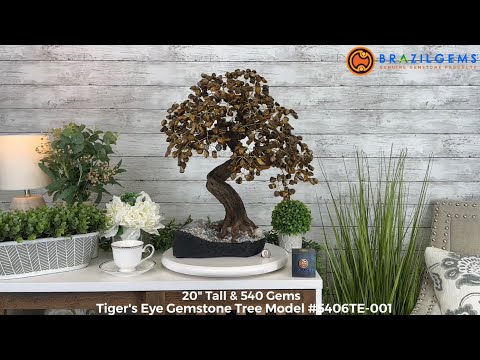 Nature and Artistry combine to create this Large Handmade Gemstone Tree with Tiger's Eye Gemstones as leaves. Set atop a large Amethyst cluster base, it has a masterfully detailed trunk and branches crafted from resin in a bonsai tree style and 108 wired branches supporting 540 tumbled gemstones.