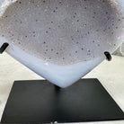 This is a polished Brazilian Agate Geode perfectly handcrafted into the shape of a Heart then placed on a black metal stand. With its polished edges, and natural crystals shining through you'll enjoy this piece for years to come.