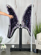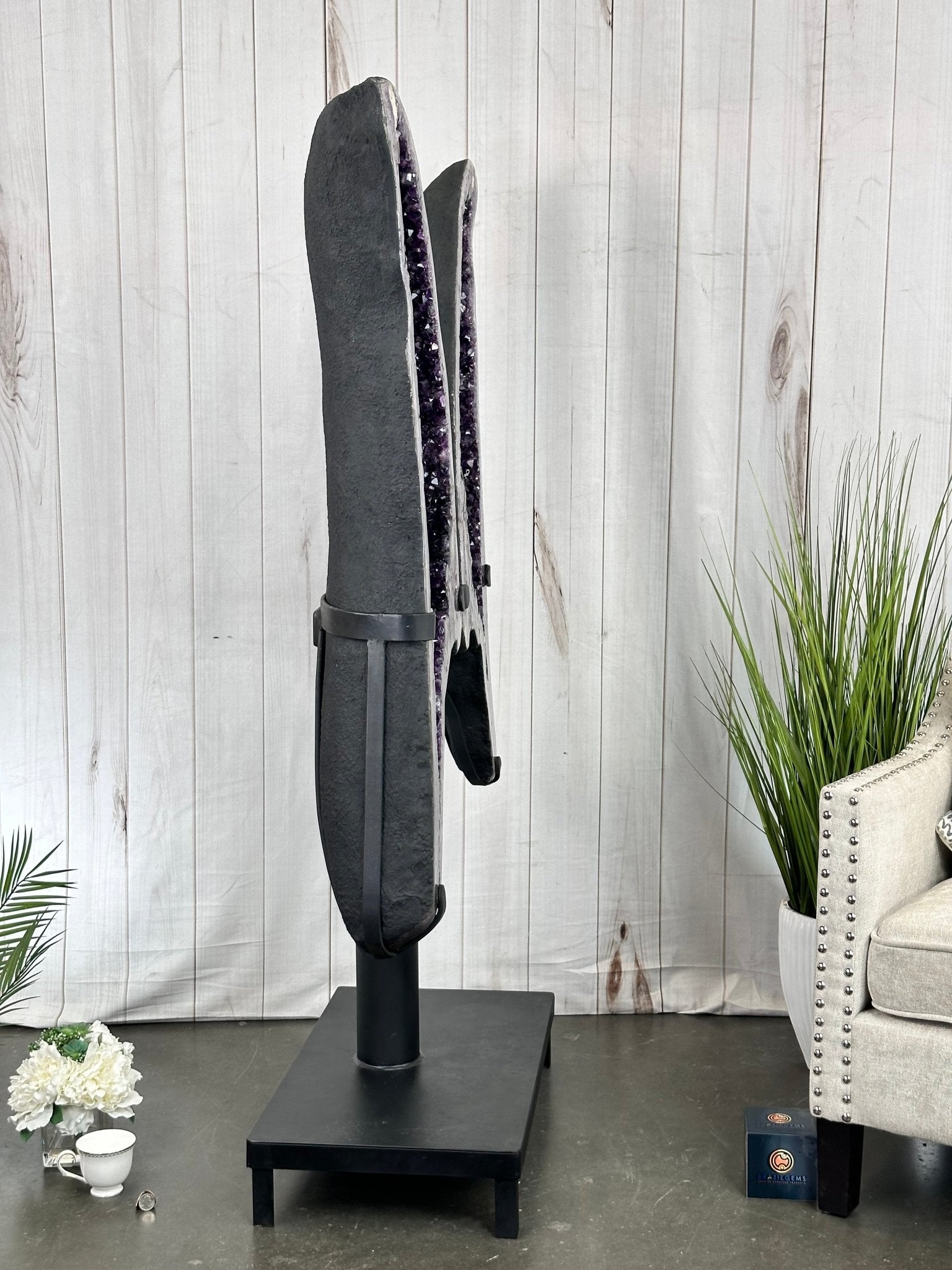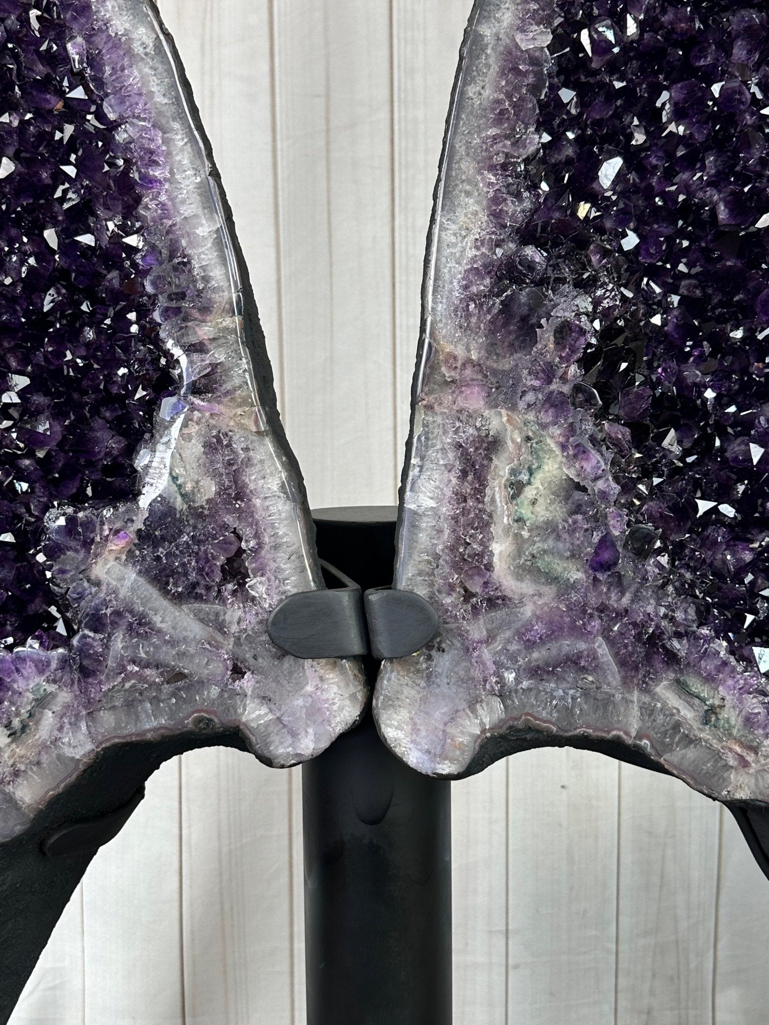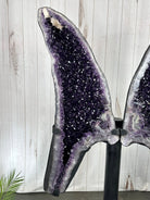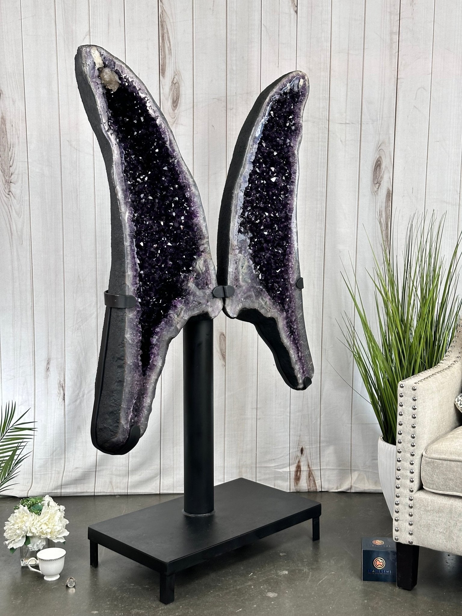 Butterfly wings come from one single Amethyst geode cut in half and placed in a very sturdy black metal base that displays it beautifully side by side.
