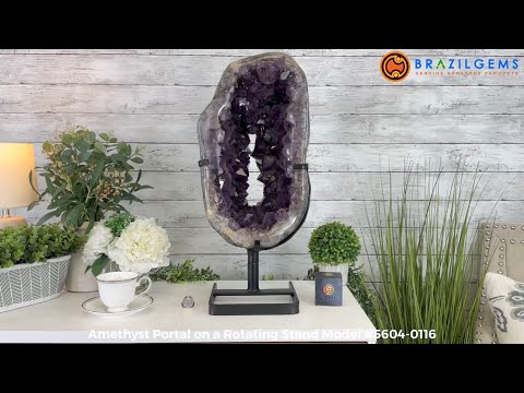 Experience the luxury offered by this Extra Plus Quality Brazilian Amethyst Crystal Portal on a black rotating metal stand by Brazil Gems®.