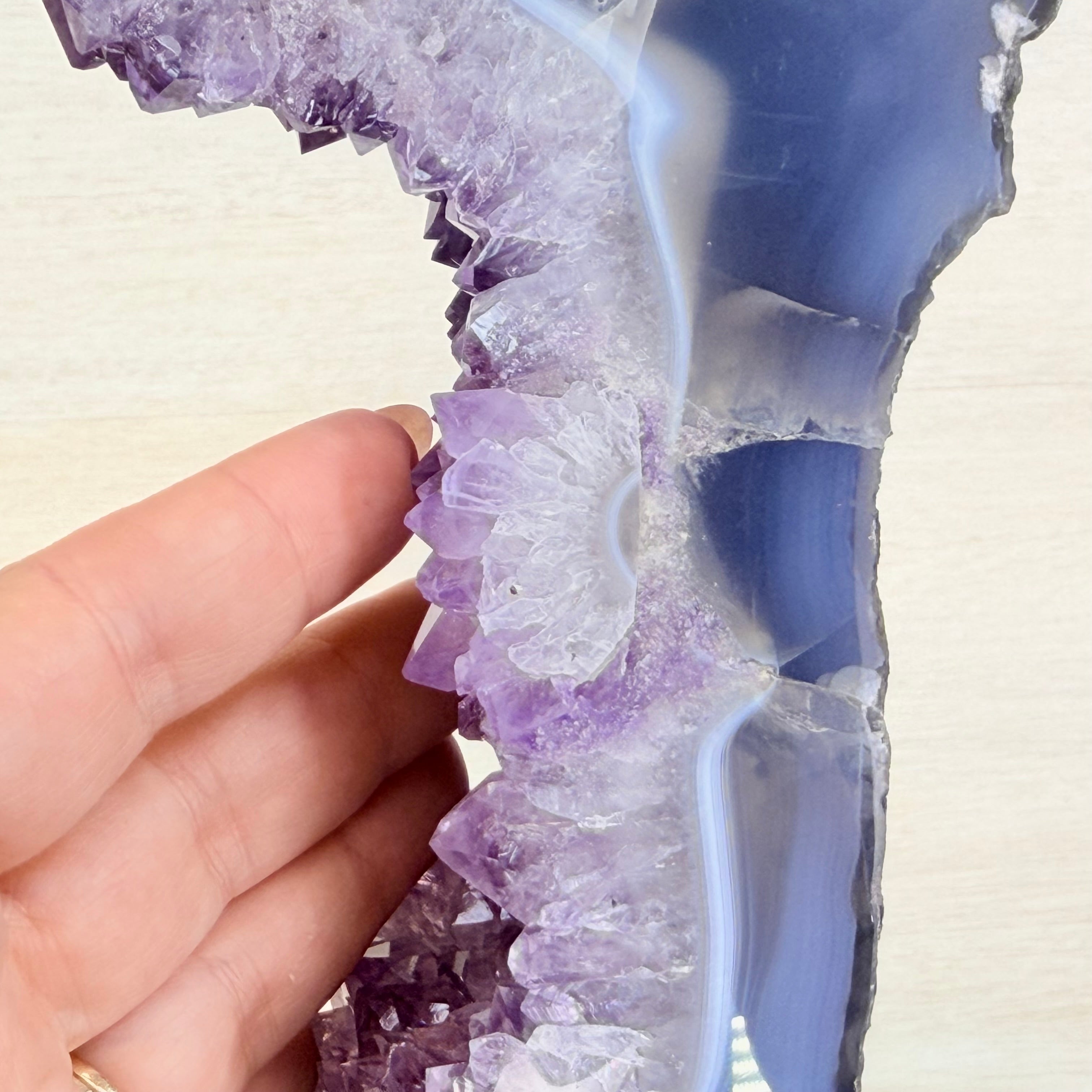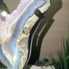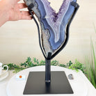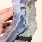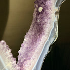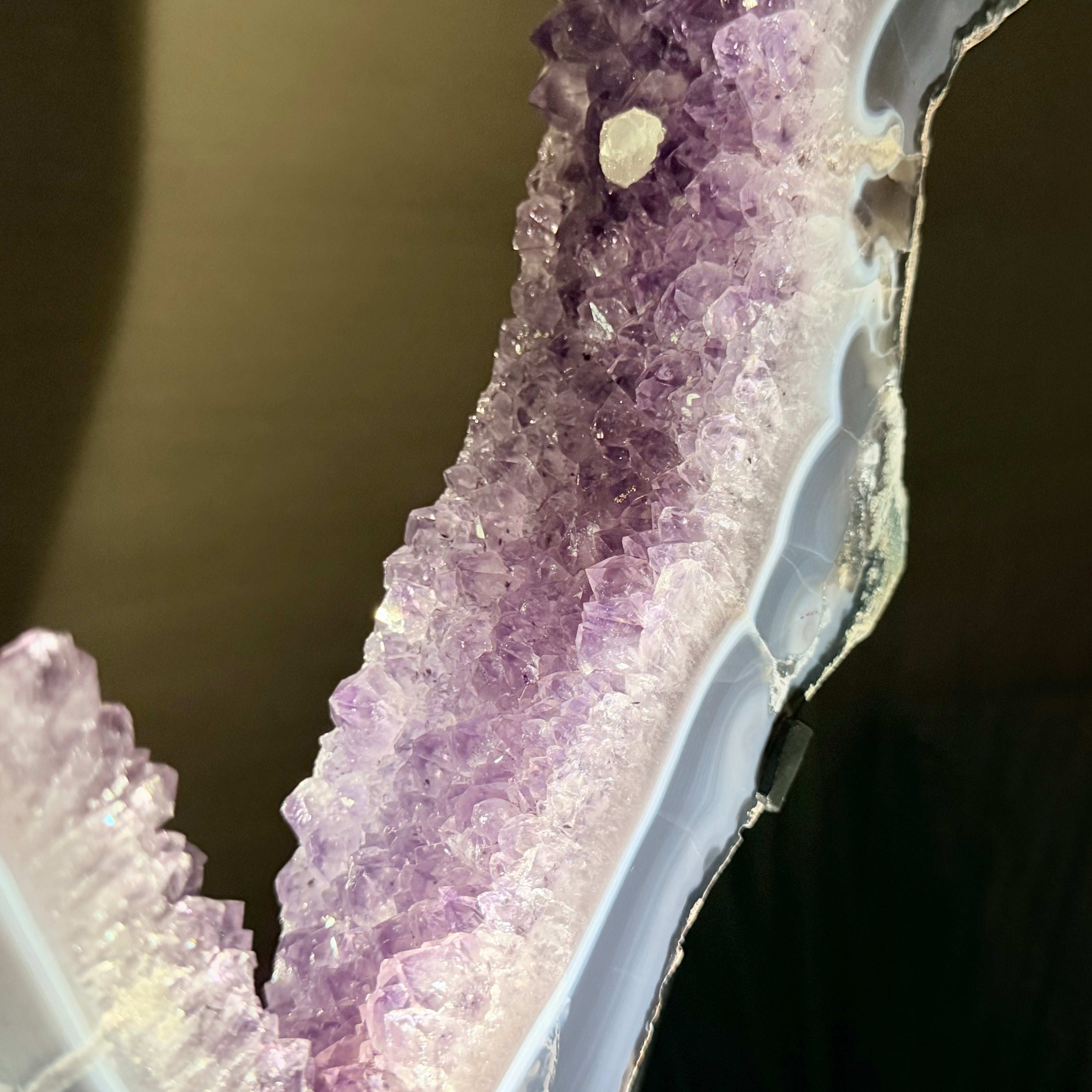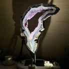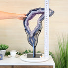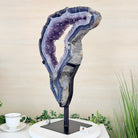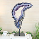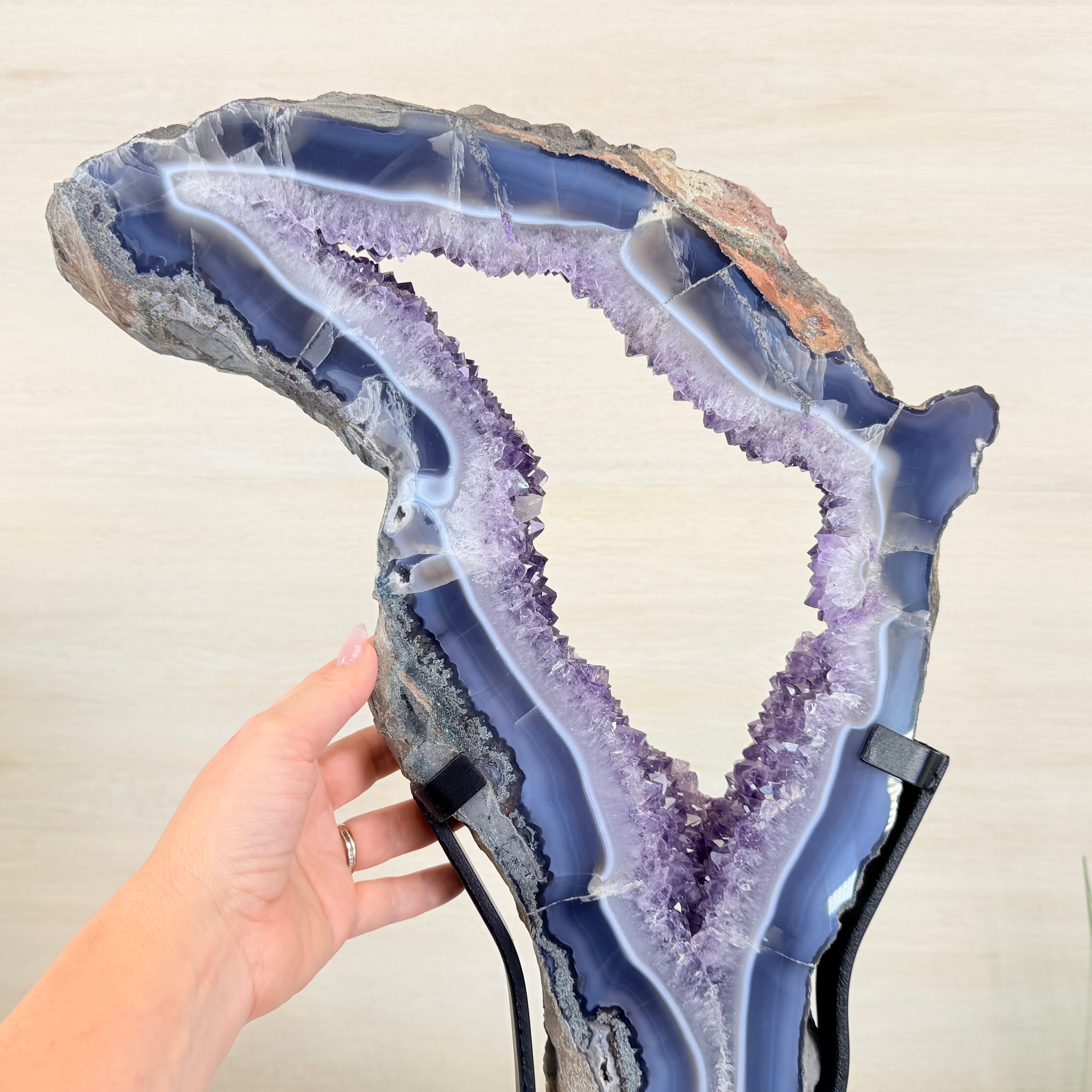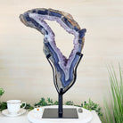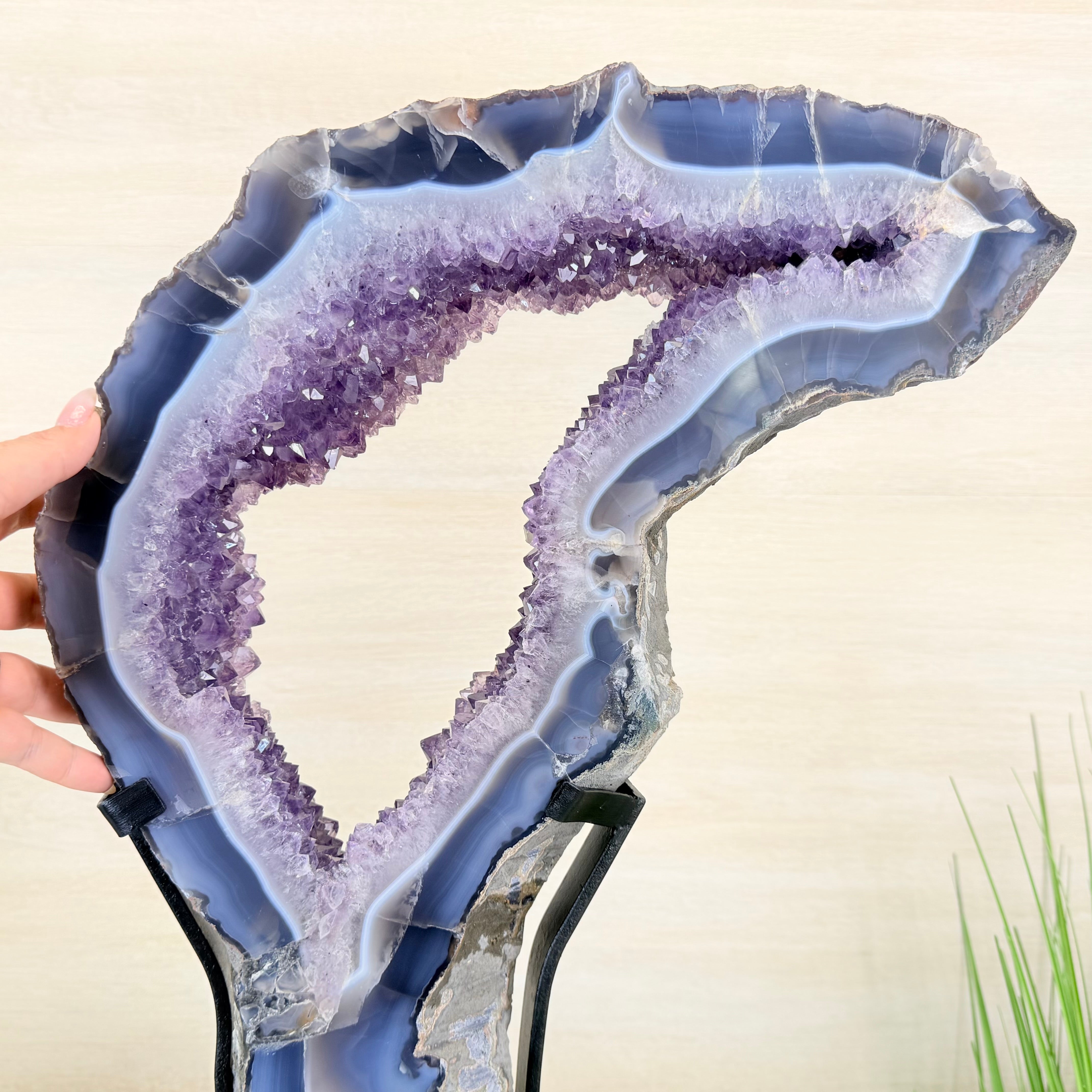 Unveil the charm of this natural Extra Quality Brazilian Amethyst Crystal "Portal" on a black metal fixed stand. Smoothly polished on both sides, this piece has a natural and rough outer shell. The large Agate bands make along the edges make this piece special!
