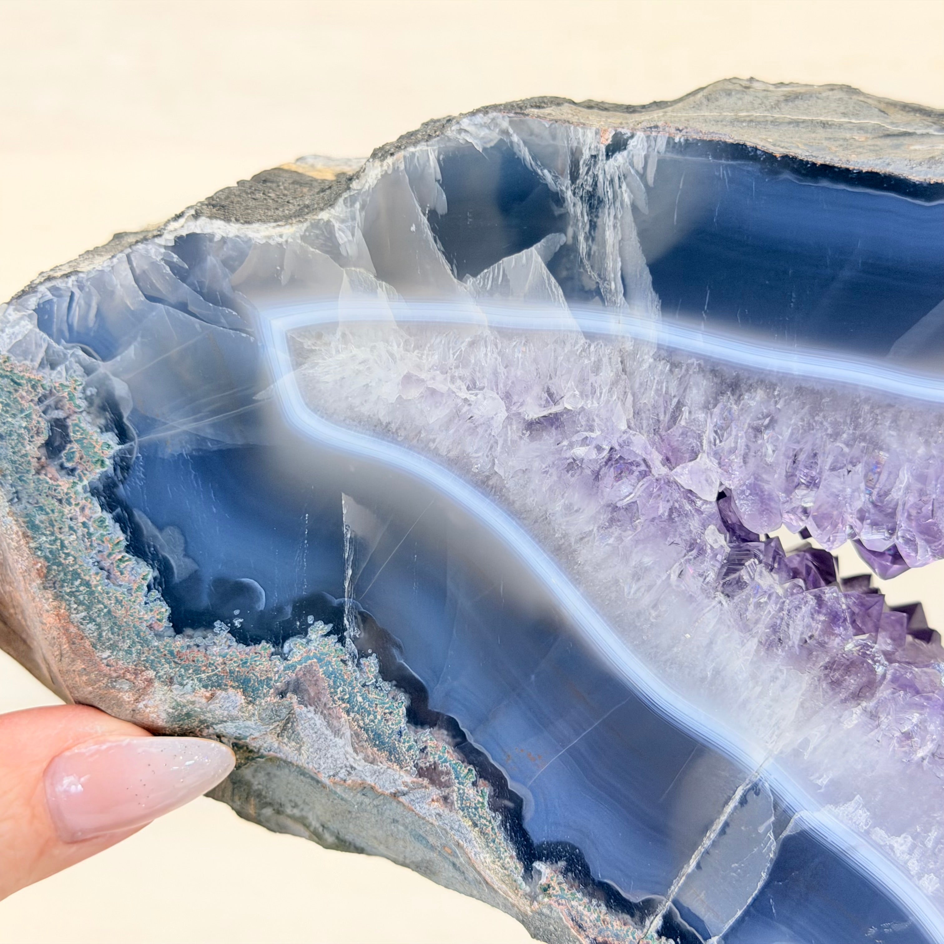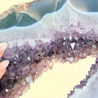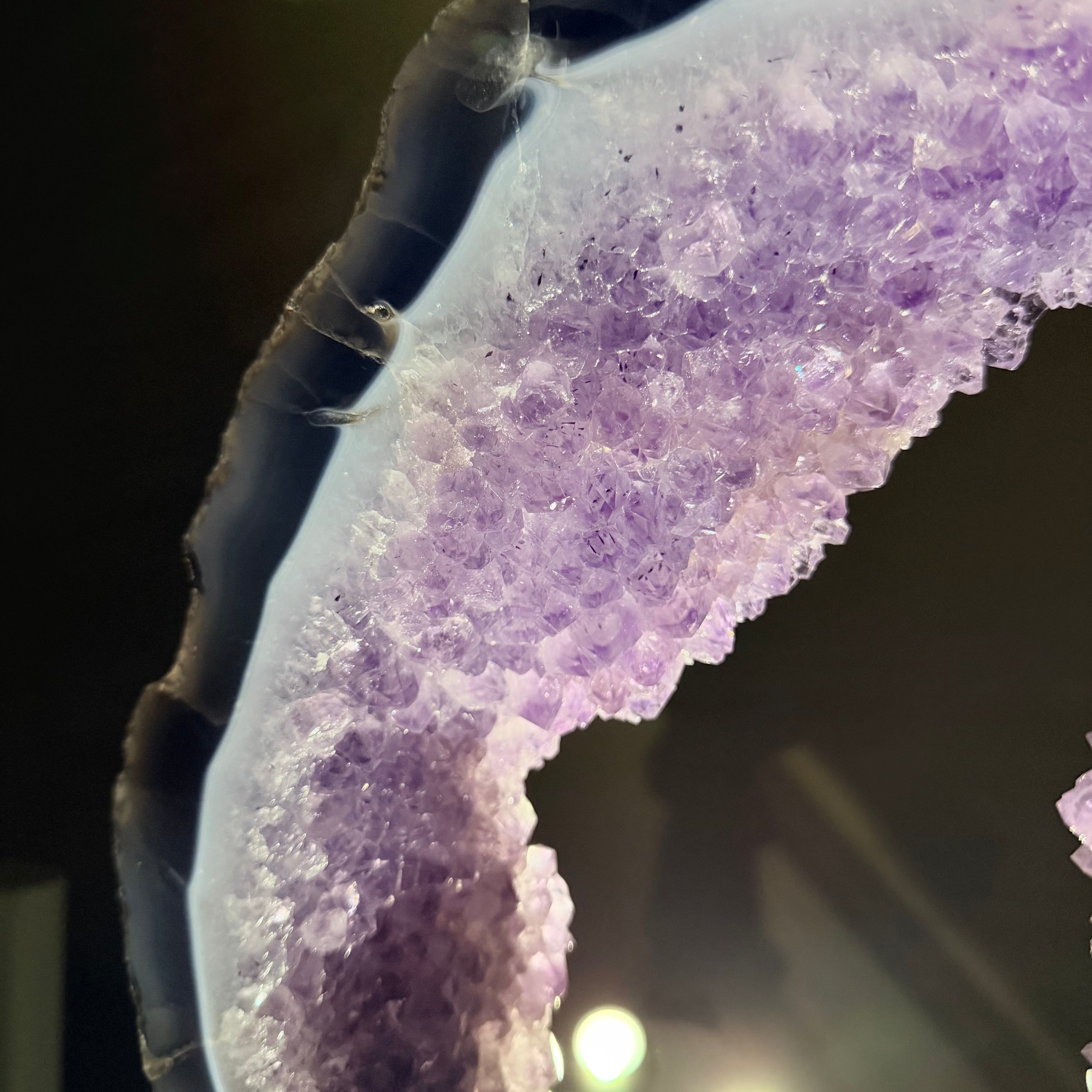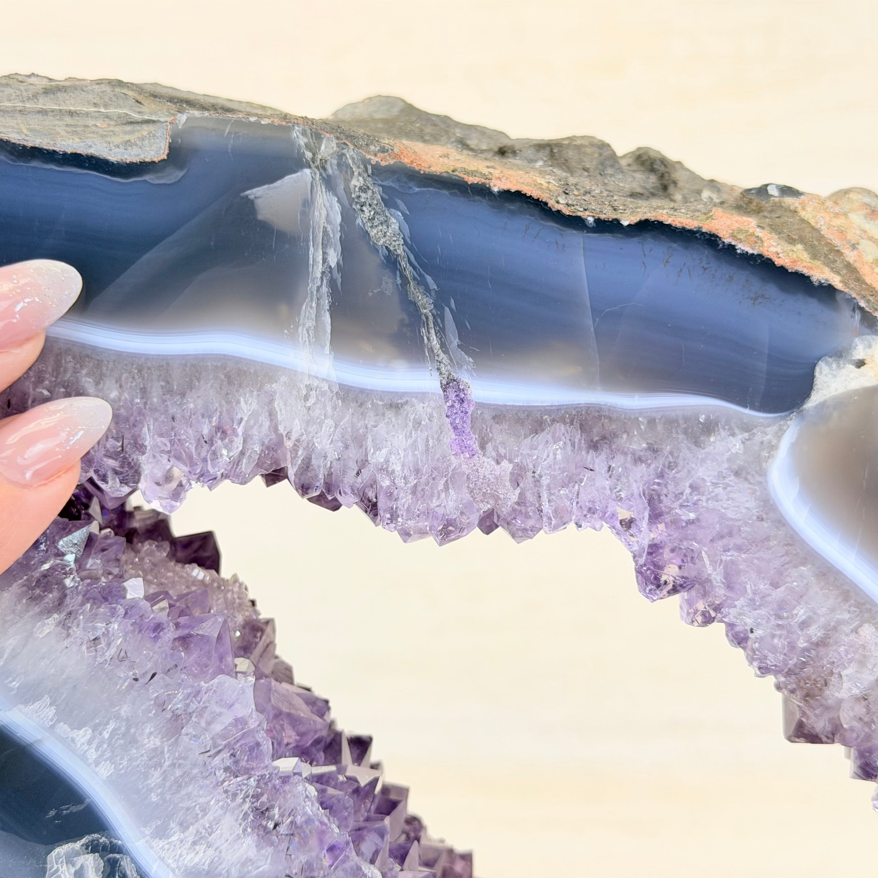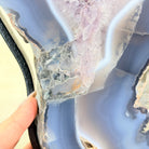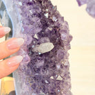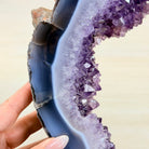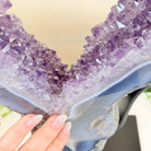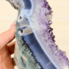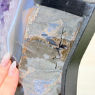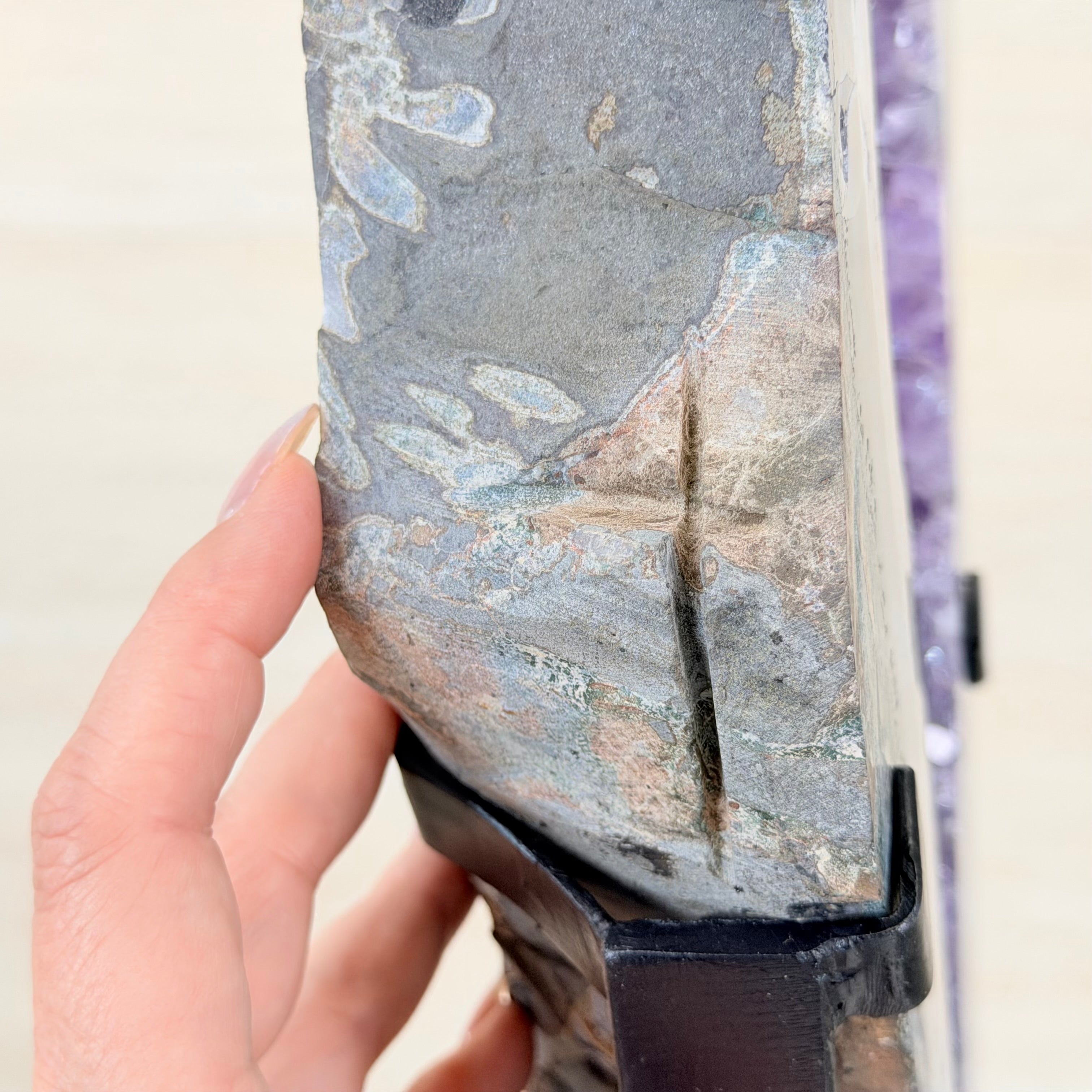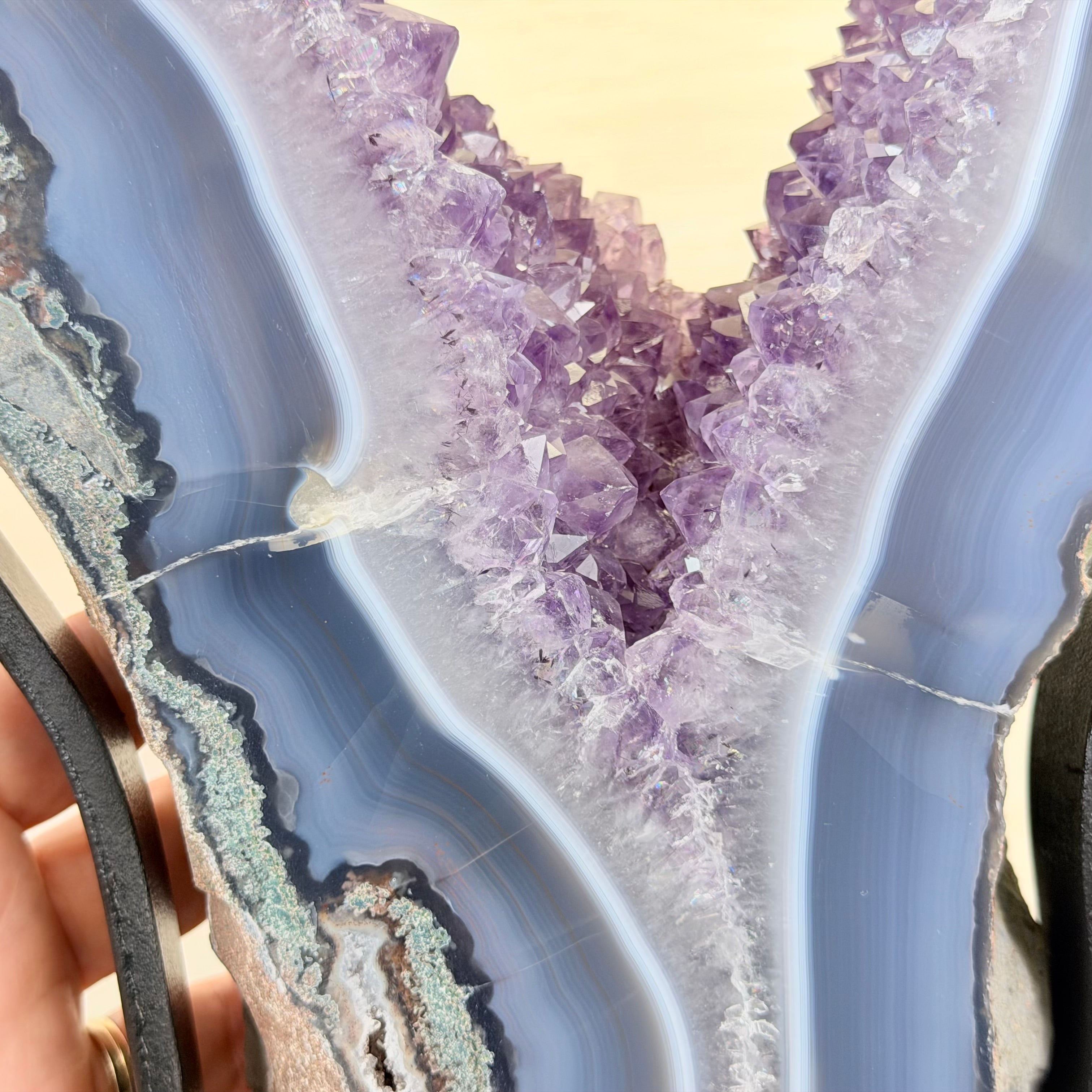 Unveil the charm of this natural Extra Quality Brazilian Amethyst Crystal "Portal" on a black metal fixed stand. Smoothly polished on both sides, this piece has a natural and rough outer shell. The large Agate bands make along the edges make this piece special!