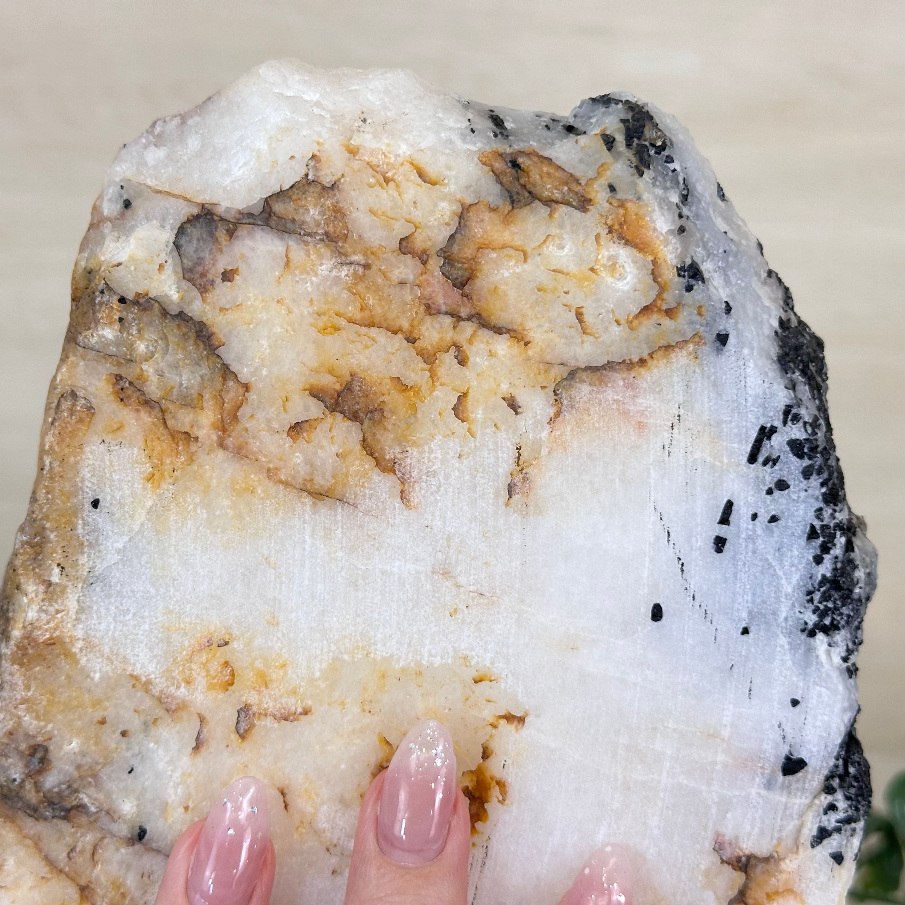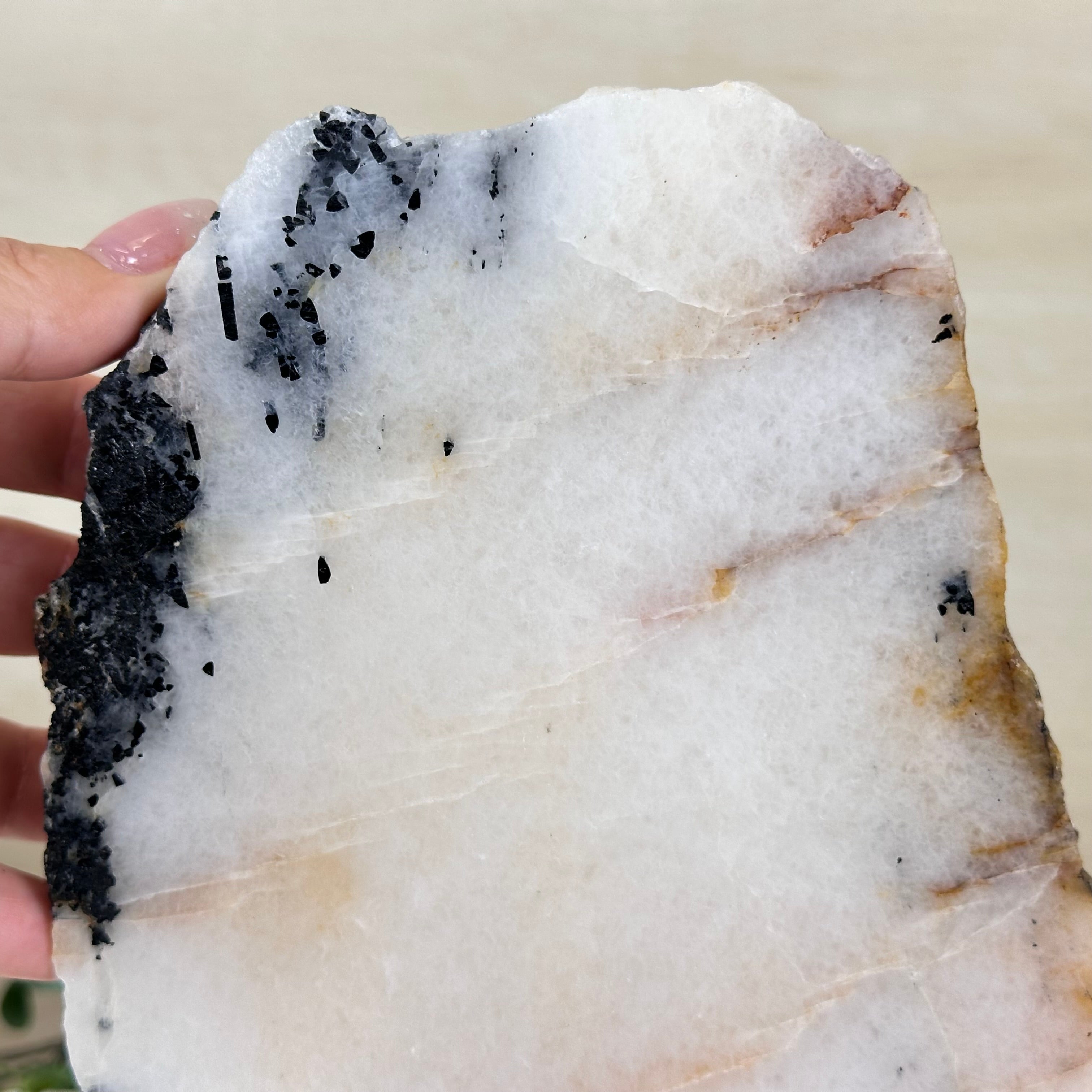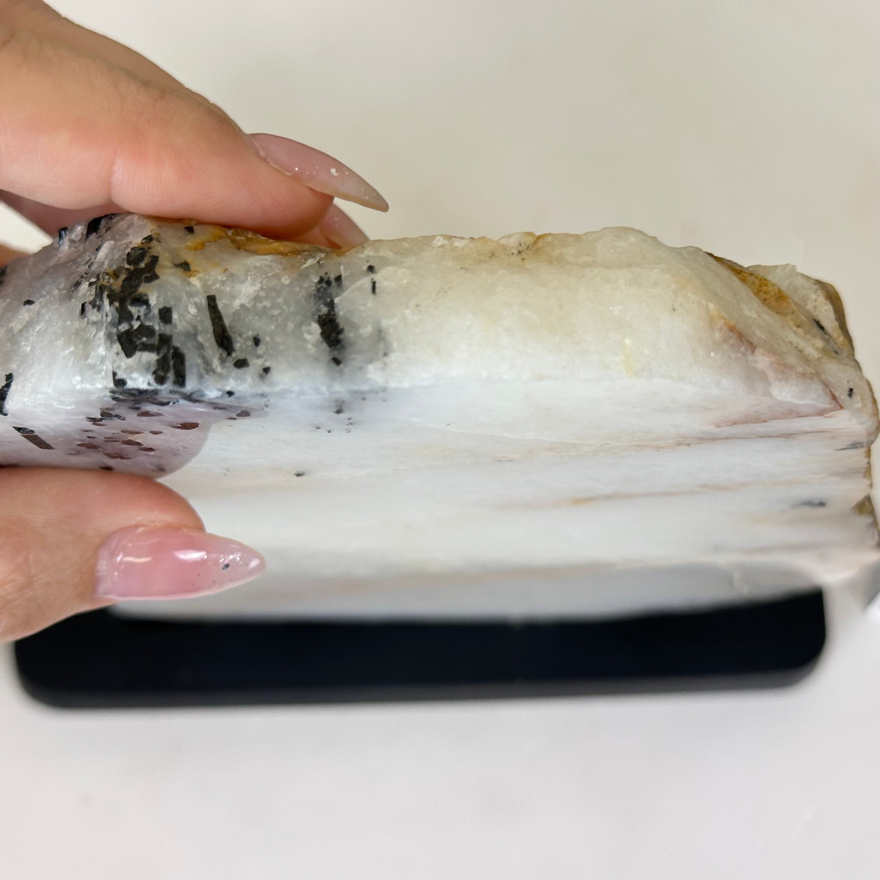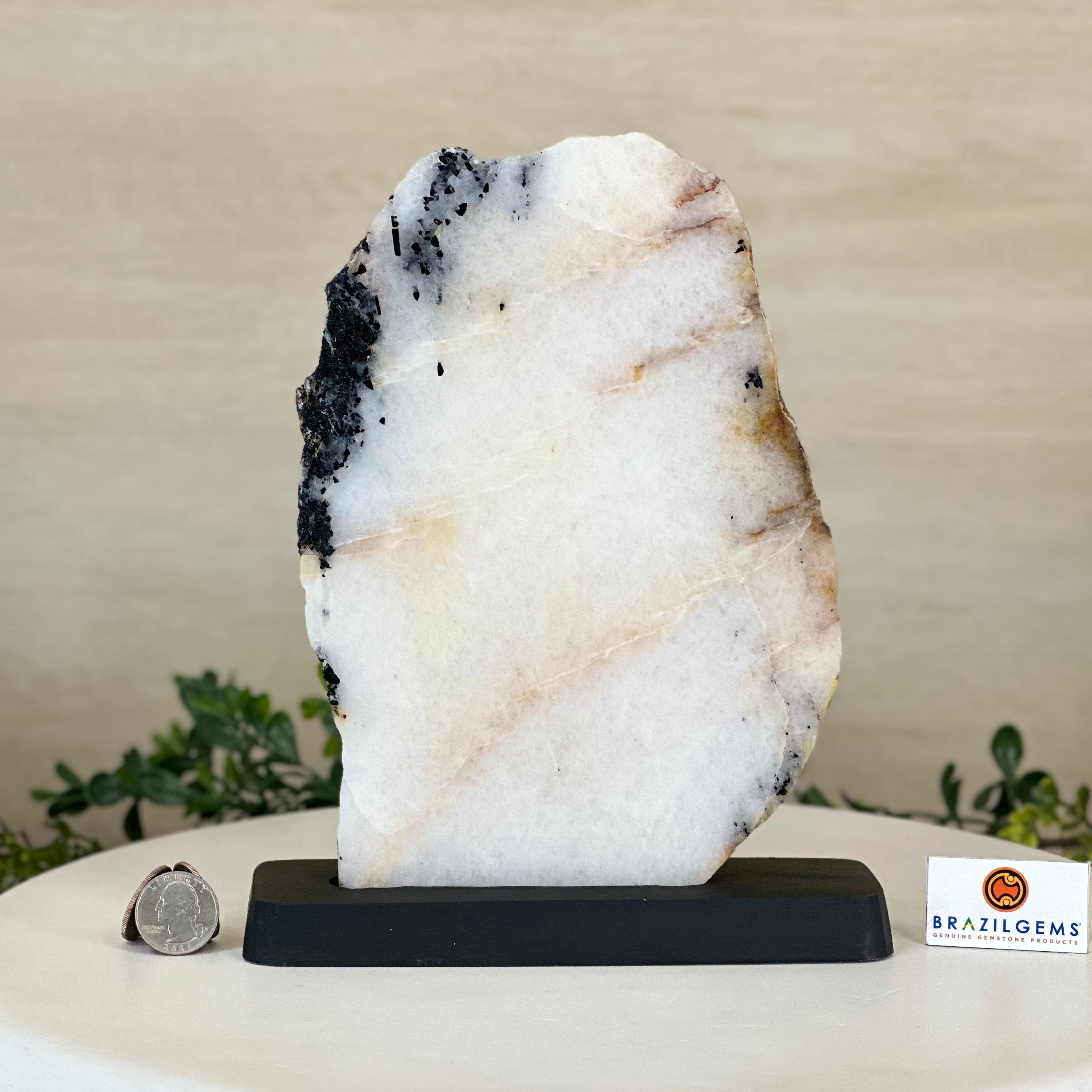 Elevate your space with this Brazilian Tourmalinated Quartz Slice on a wood base. Tourmalinated Quartz is a dazzling gemstone that has Black Tourmaline threads naturally embedded in Clear or Milky Quartz. This piece is beautifully polished on the front with rough edges on the sides and the back. This slice will make a great addition or start to your crystal collection and will accent the décor of any room.