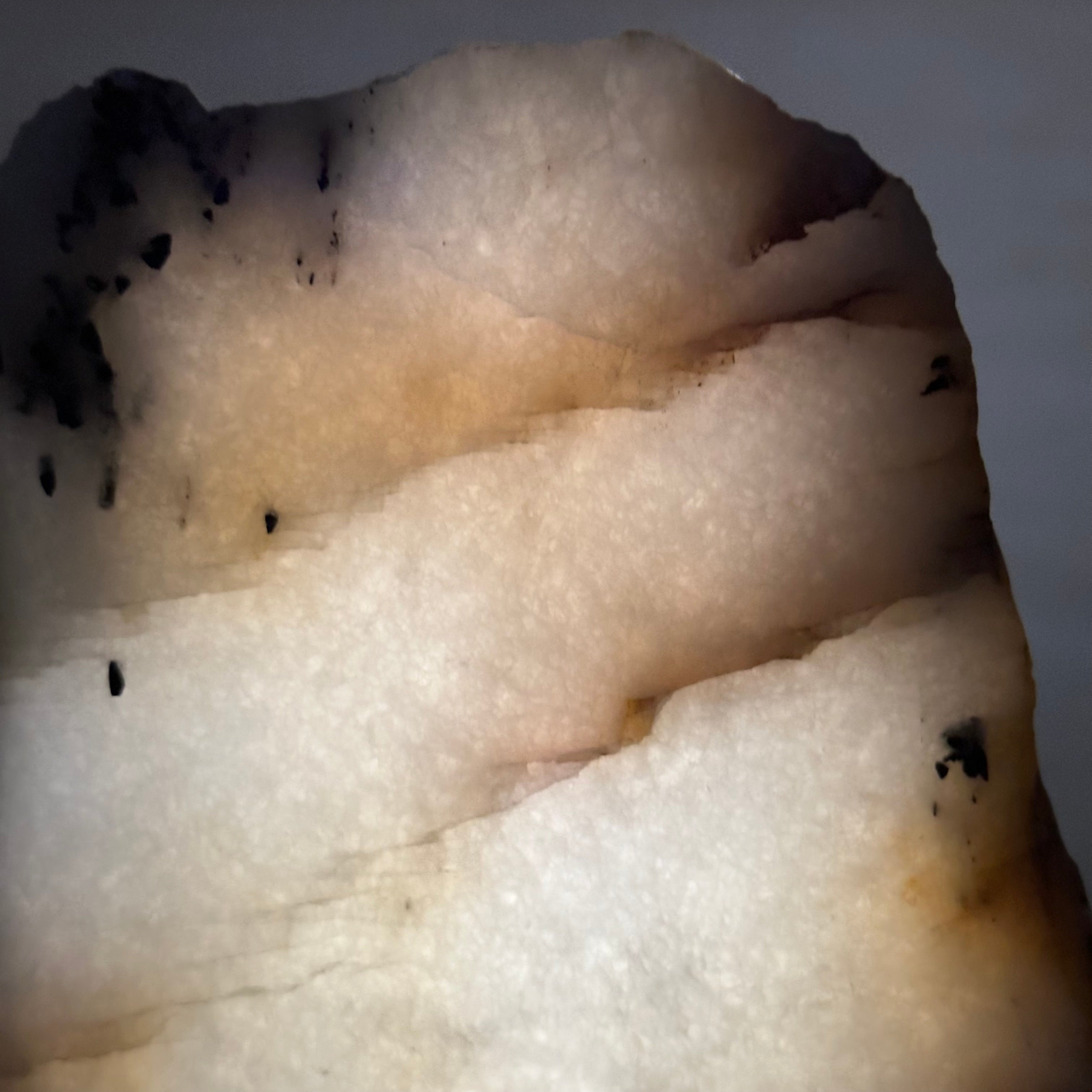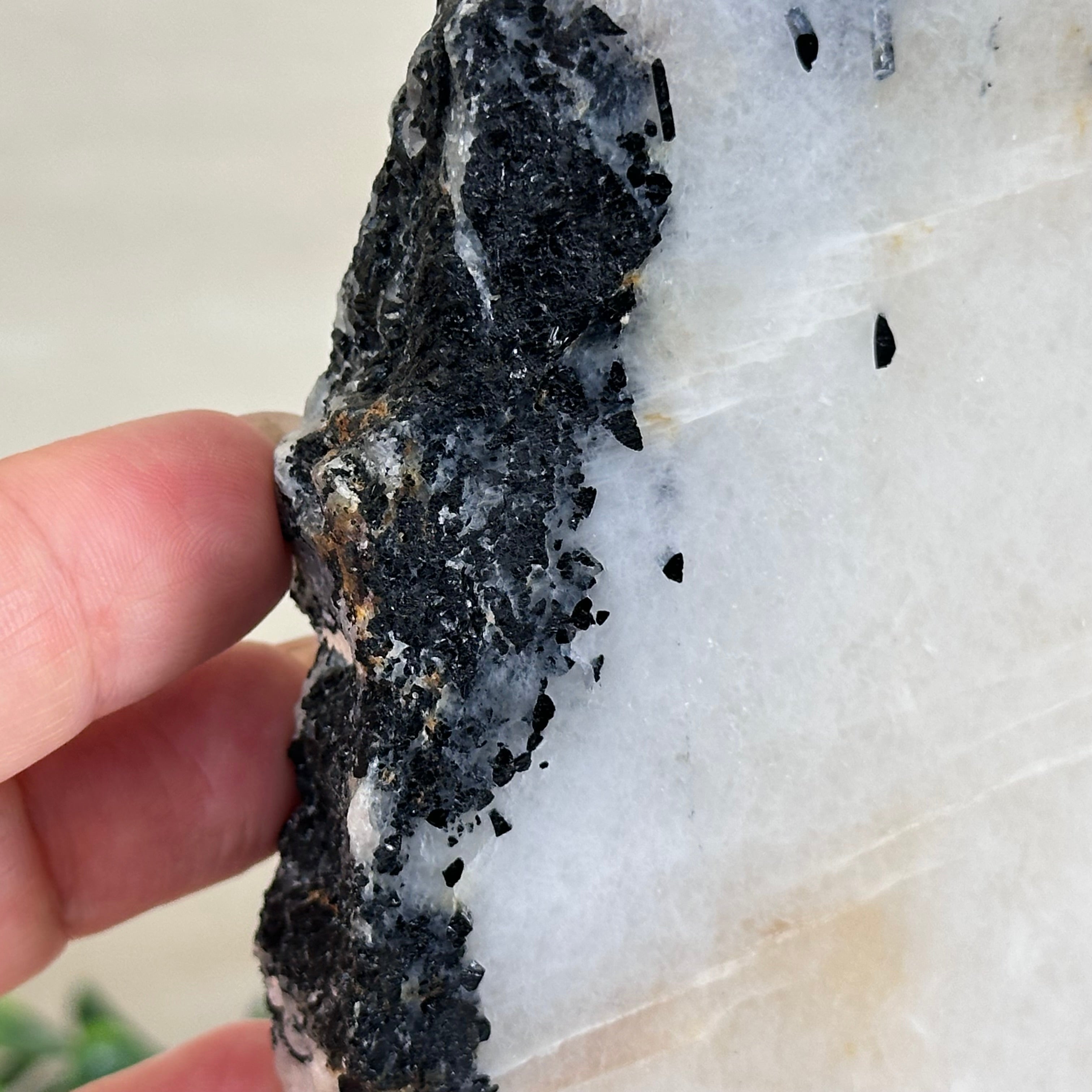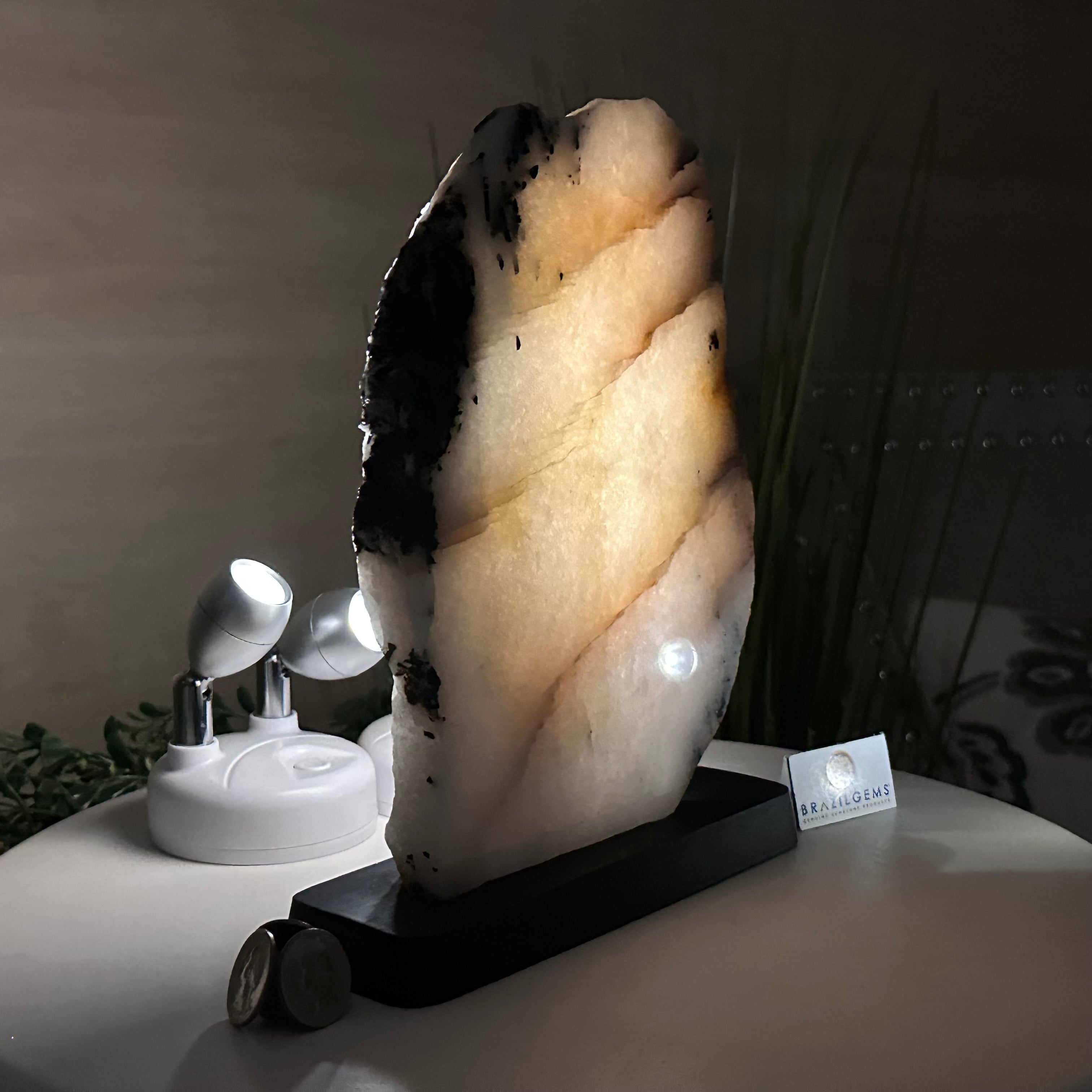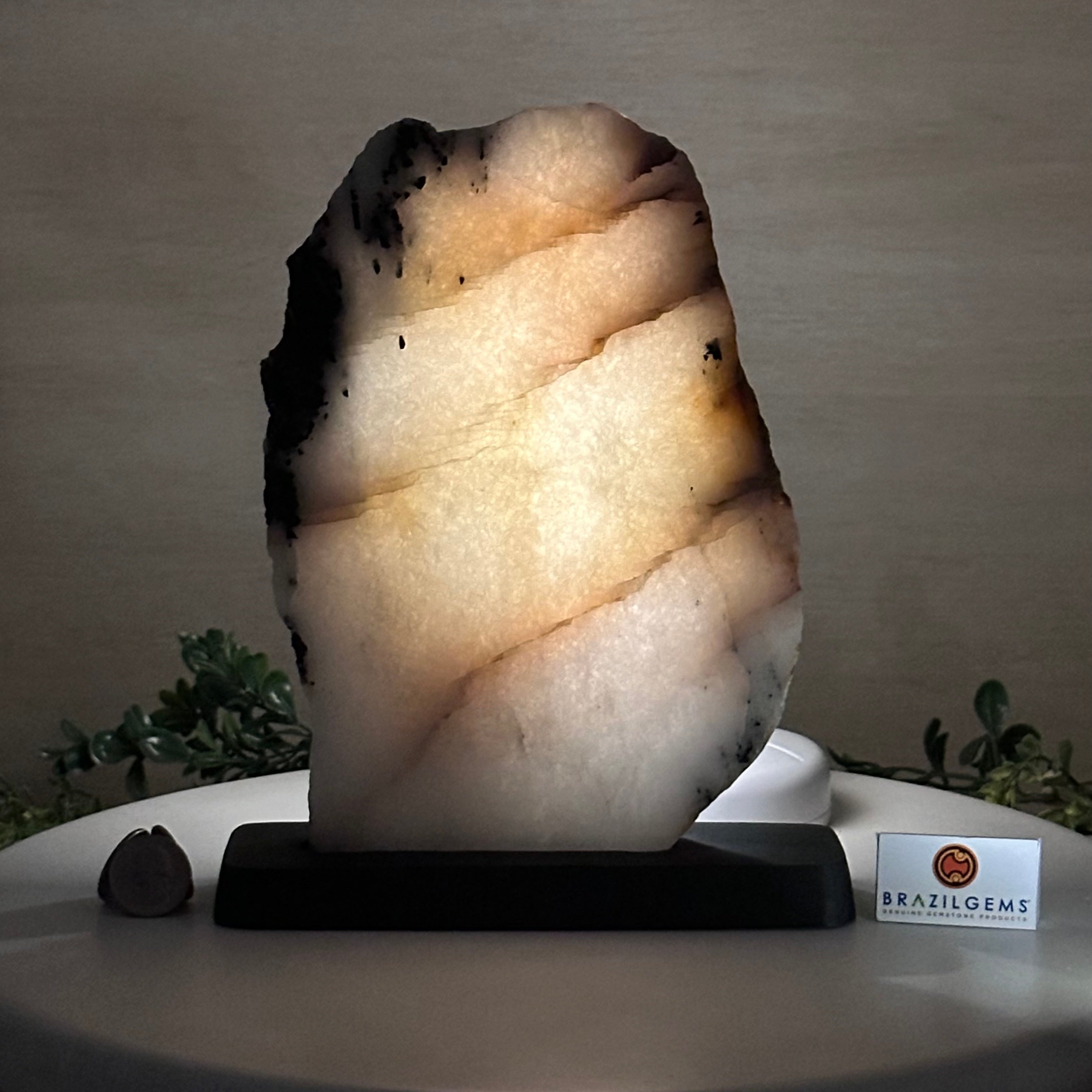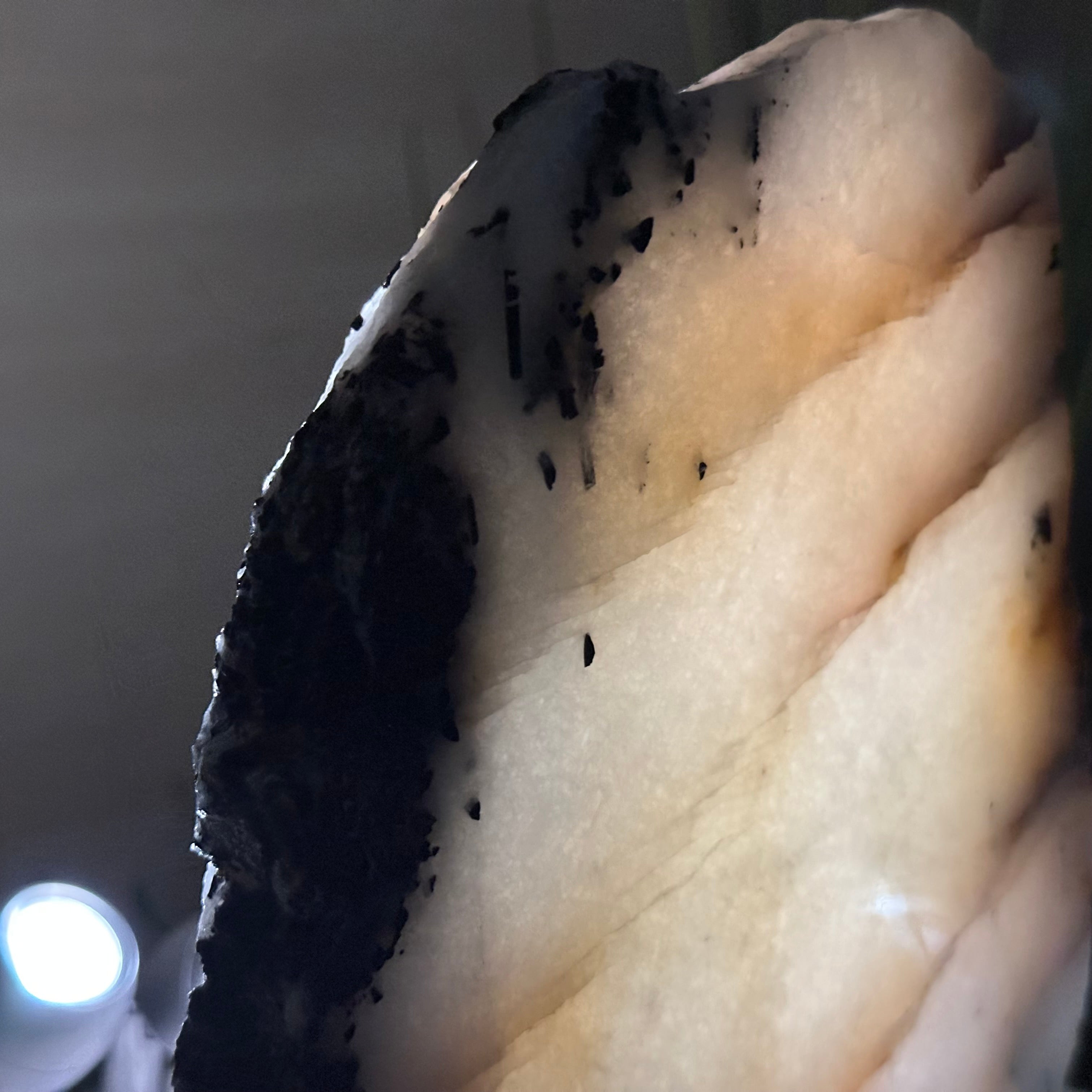 Elevate your space with this Brazilian Tourmalinated Quartz Slice on a wood base. Tourmalinated Quartz is a dazzling gemstone that has Black Tourmaline threads naturally embedded in Clear or Milky Quartz. This piece is beautifully polished on the front with rough edges on the sides and the back. This slice will make a great addition or start to your crystal collection and will accent the décor of any room.